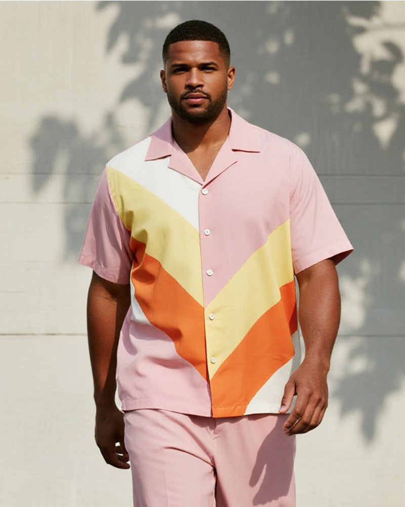 Big & Tall Men's Business Pink Color Block Printed Short Sleeve Shirt Trousers Suit