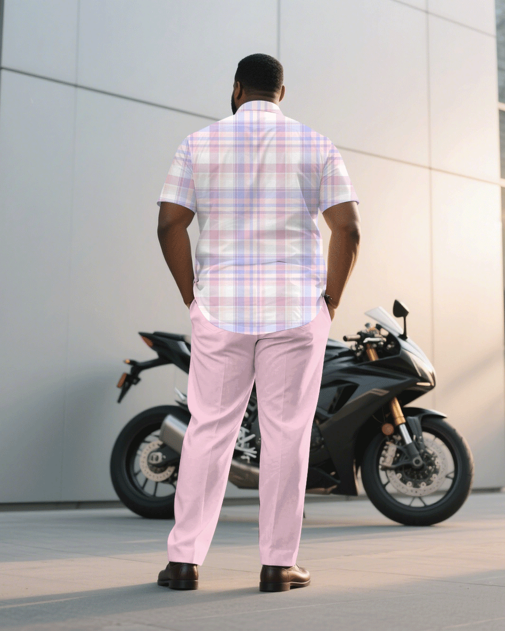 Big & Tall Men's Business Pink Plaid Short Sleeve Shirt Pants Suit