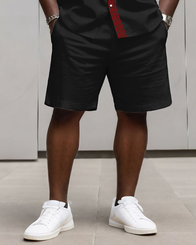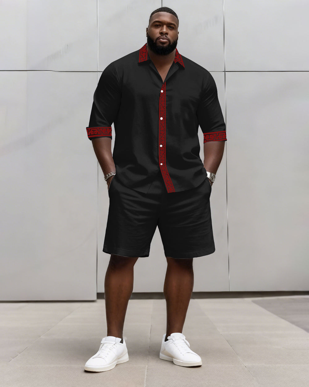 Big & Tall Men's Business Simple Black & Red Geometric Texture Contrast Long Sleeve Shirt Shorts Set