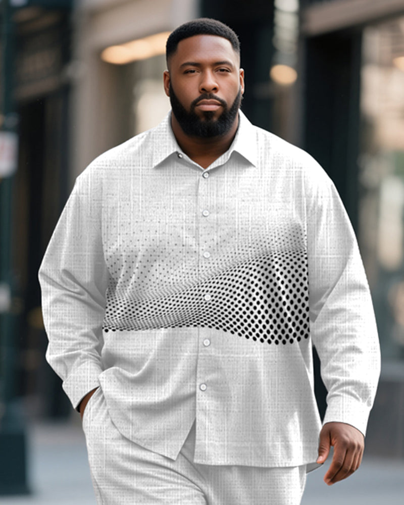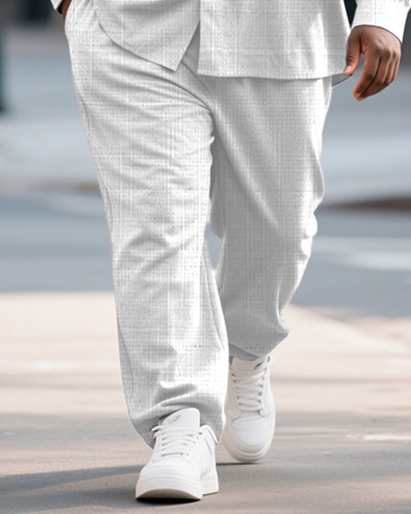 Big & Tall Men's Business White Geometric Wave Print Bamboo Hemp Texture Long Sleeve Shirt Trousers Suit