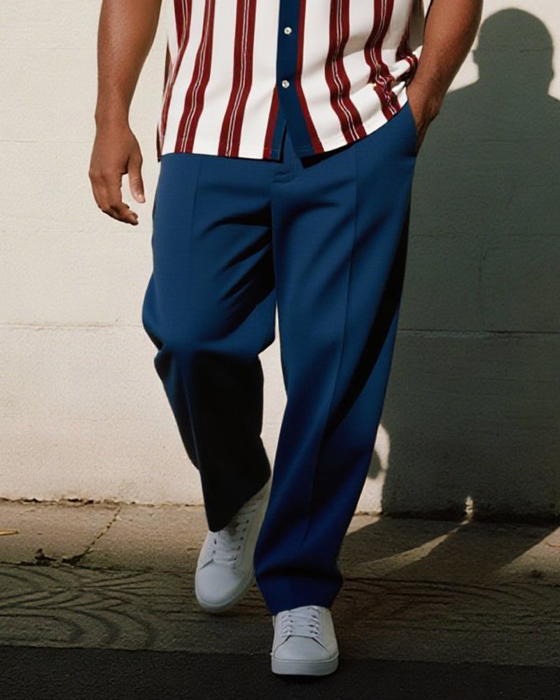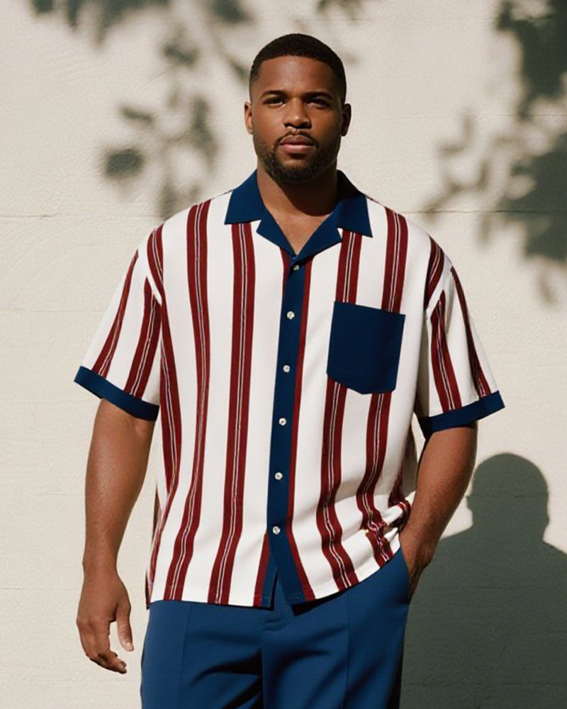 Big & Tall Men's Business Wine Red Blue Colorblock Striped Printed Pocket Short Sleeve Shirt Trousers Suit