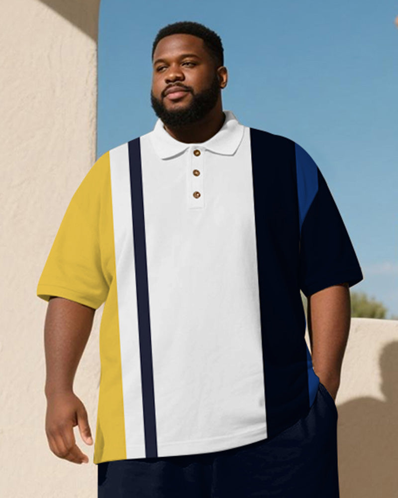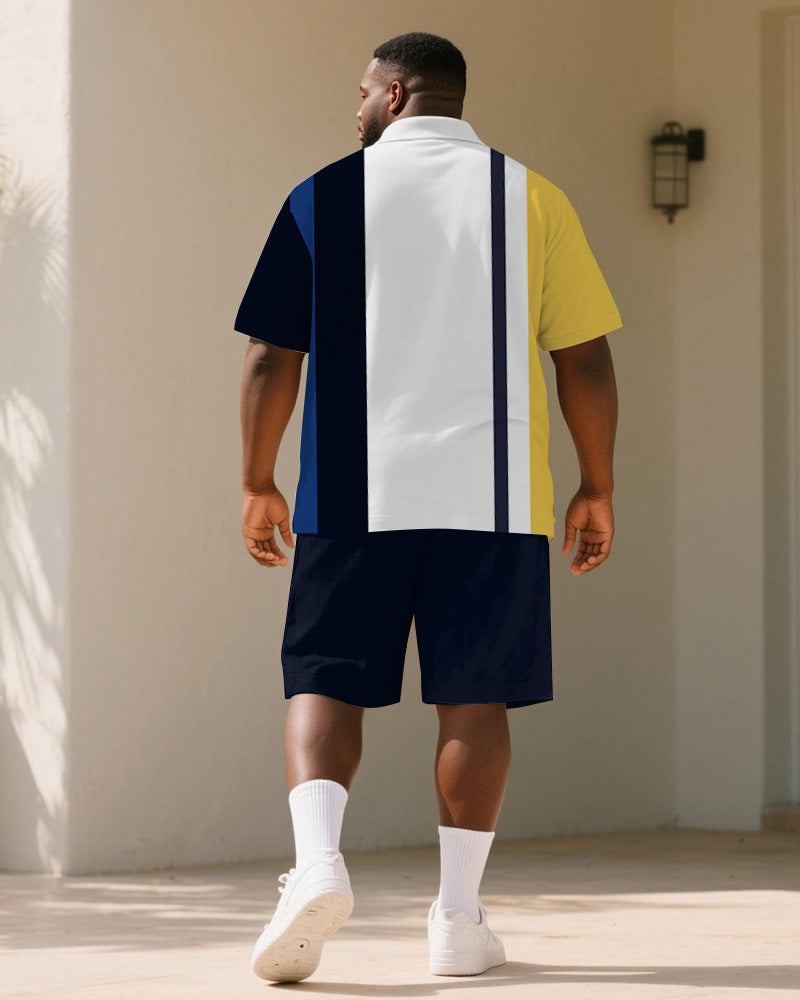 Big & Tall Men's Business Yellow Blue Stripe Print Short Sleeve Polo Shirt Shorts Suit