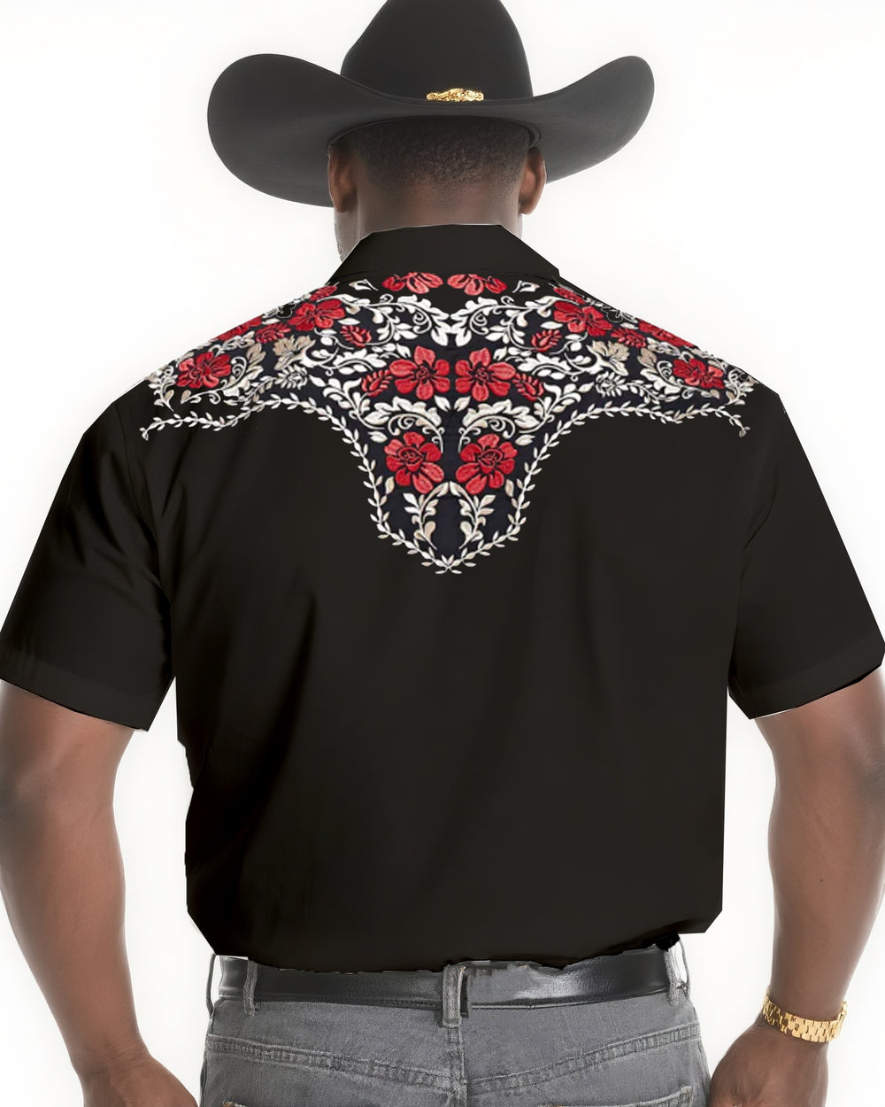 Big & Tall Men's Cattle Ranch Daily Casual Floral Design Textured Black Short Sleeve Shirt