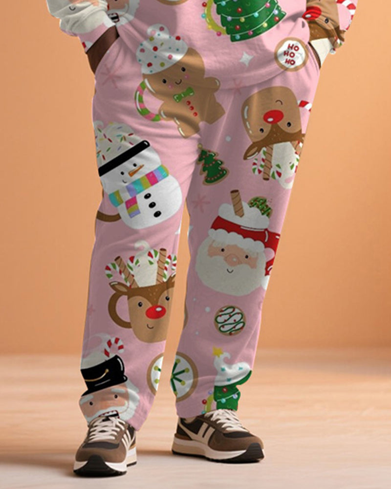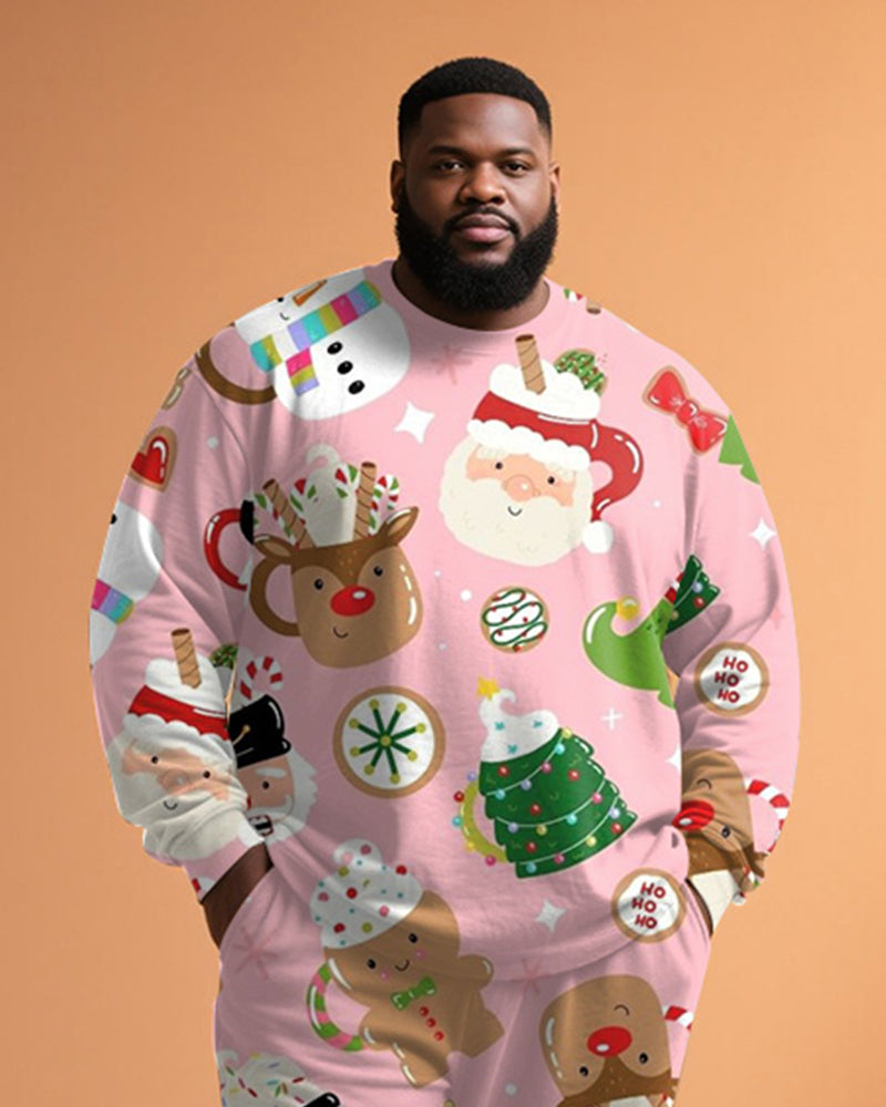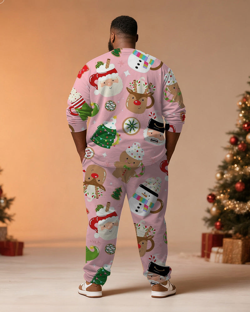 Big & Tall Men's Christmas Pink Cartoon Graffiti Print Long Sleeve T-Shirt Pants Set