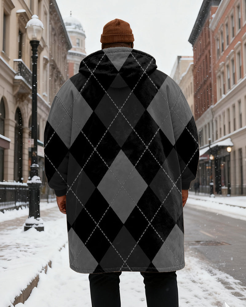Big & Tall Men's Classic Black Diamond Plaid Printed Velvet Thickened Long Hooded Coat