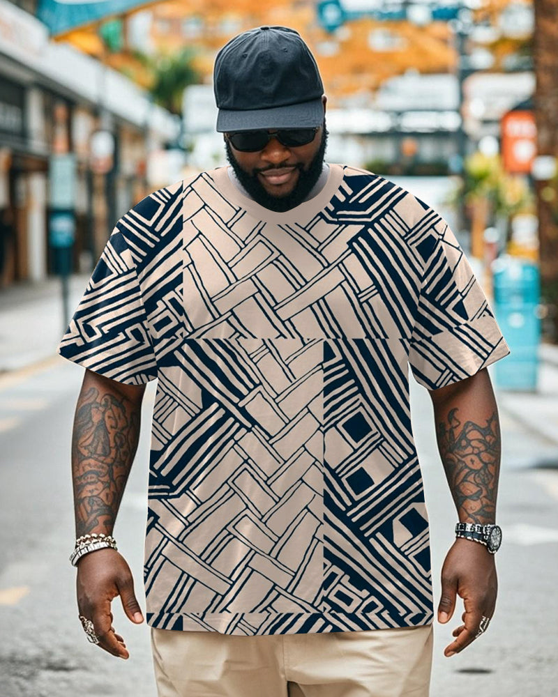 Big & Tall Men's Daily Casual Khaki Colorblock Geometric Printed Round Neck Short Sleeve T-Shirt