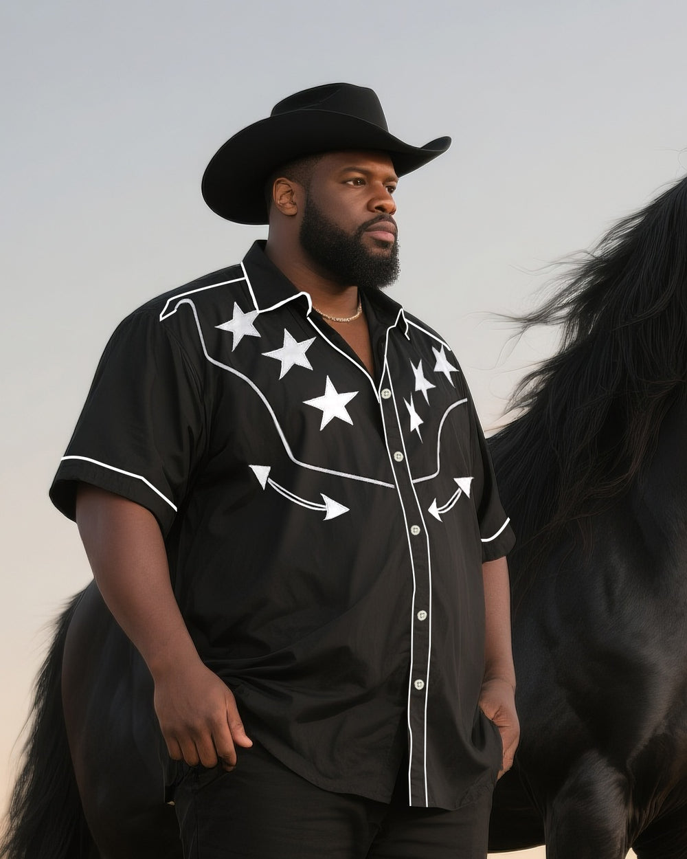 Big & Tall Men's Daily Casual Western Style Shirt-Black Short Sleeve Shirt Pants Suit