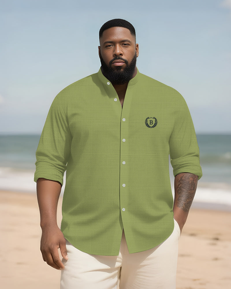 Big & Tall Men's Everyday College Style B Letter Icon Bamboo Hemp Texture Stand-up Collar Long Sleeve Shirt