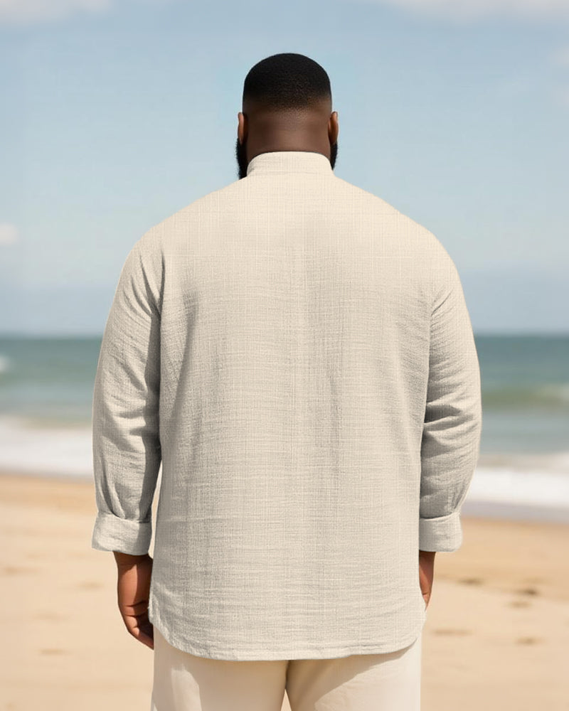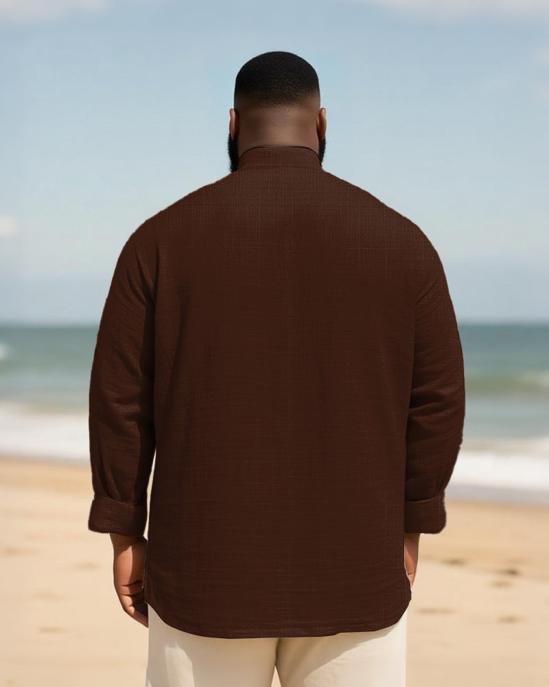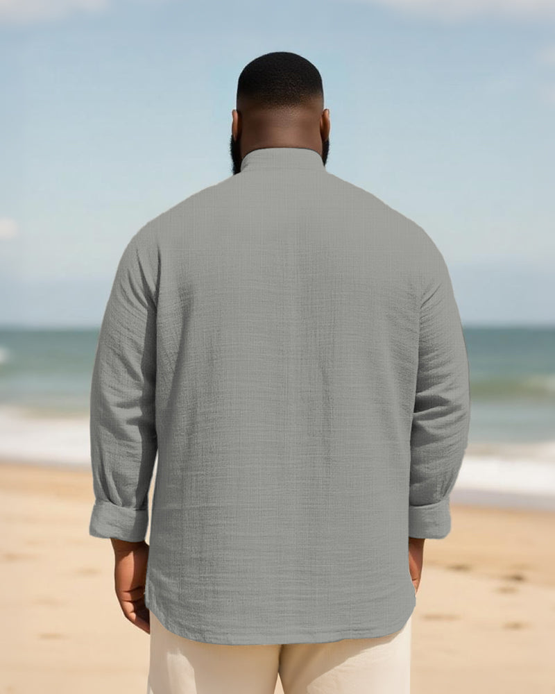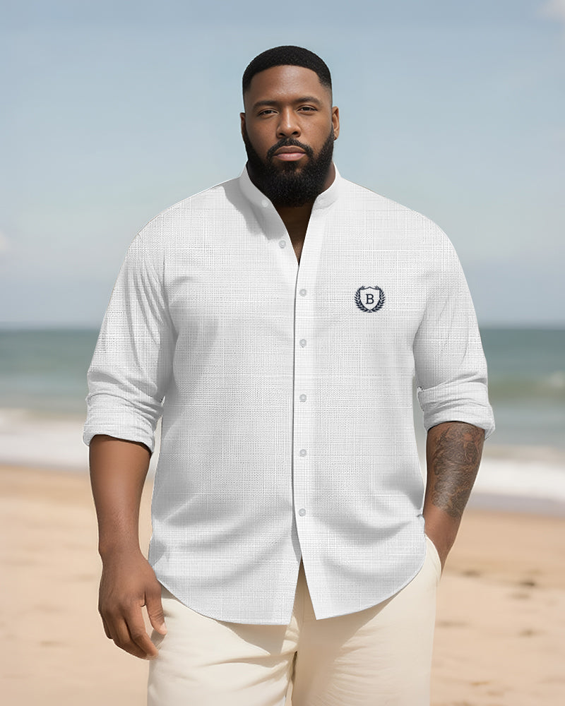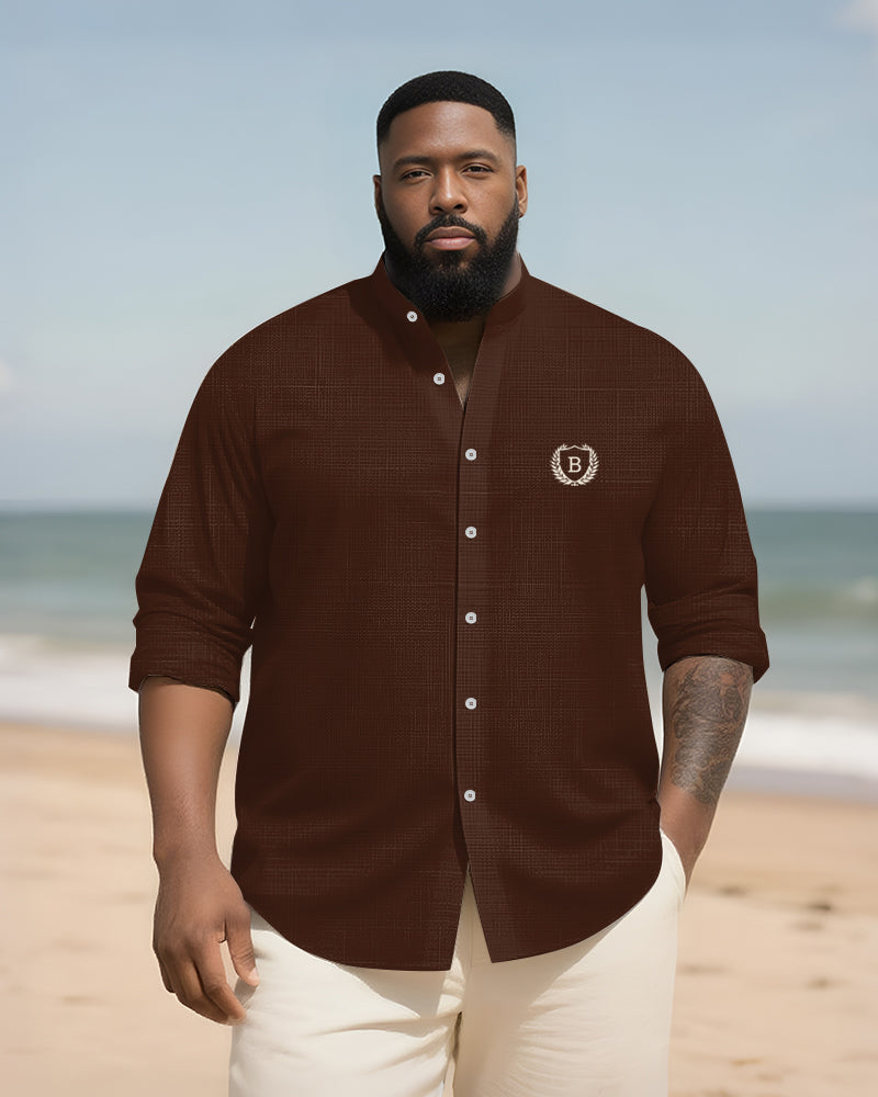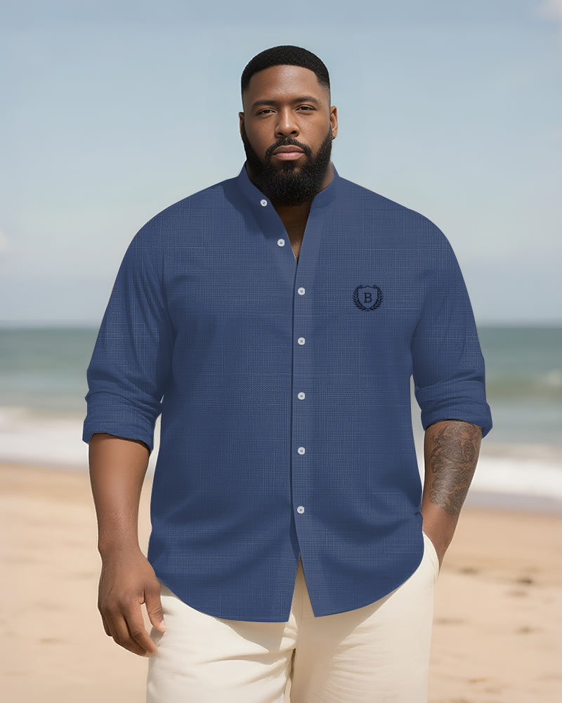 Big & Tall Men's Everyday College Style B Letter Icon Bamboo Hemp Texture Stand-up Collar Long Sleeve Shirt