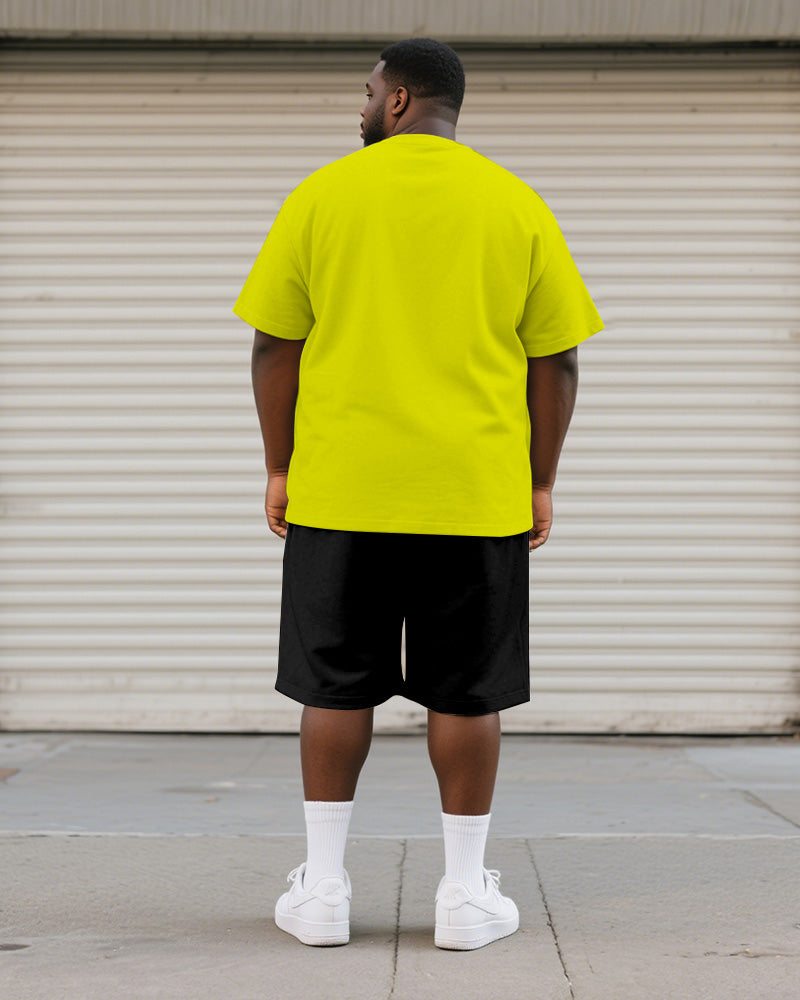 Big & Tall Men's Fluorescent Yellow Line Curved Dragon Printed Round Neck Short Sleeve T-shirt Shorts Suit