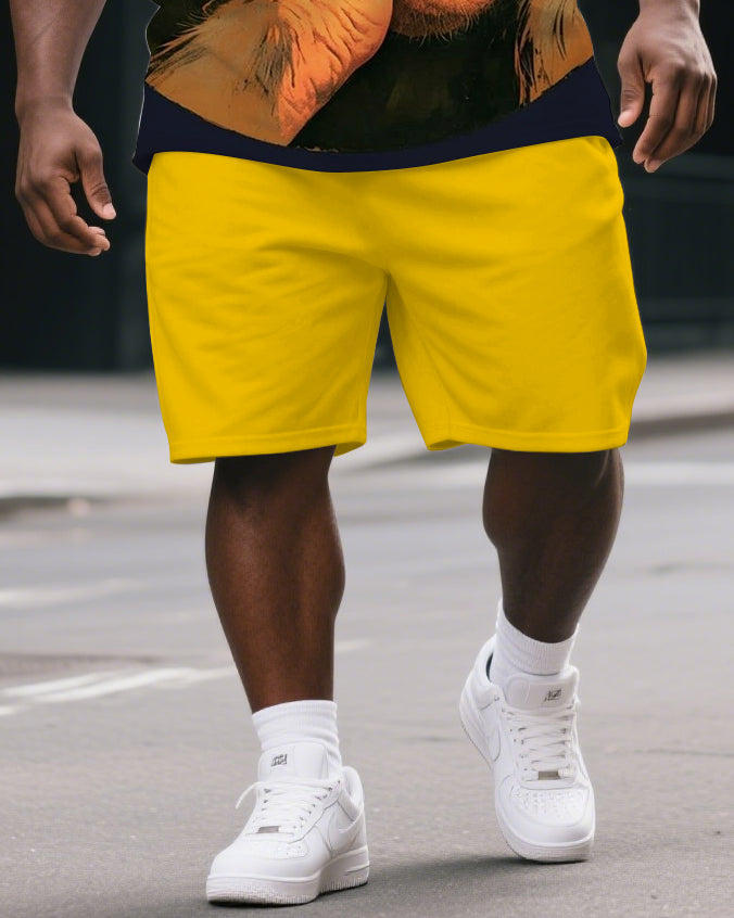 Big & Tall Men's Funny Cartoon Thinking Gorillas Print Yellow Short-Sleeved T-shirt and Short Set