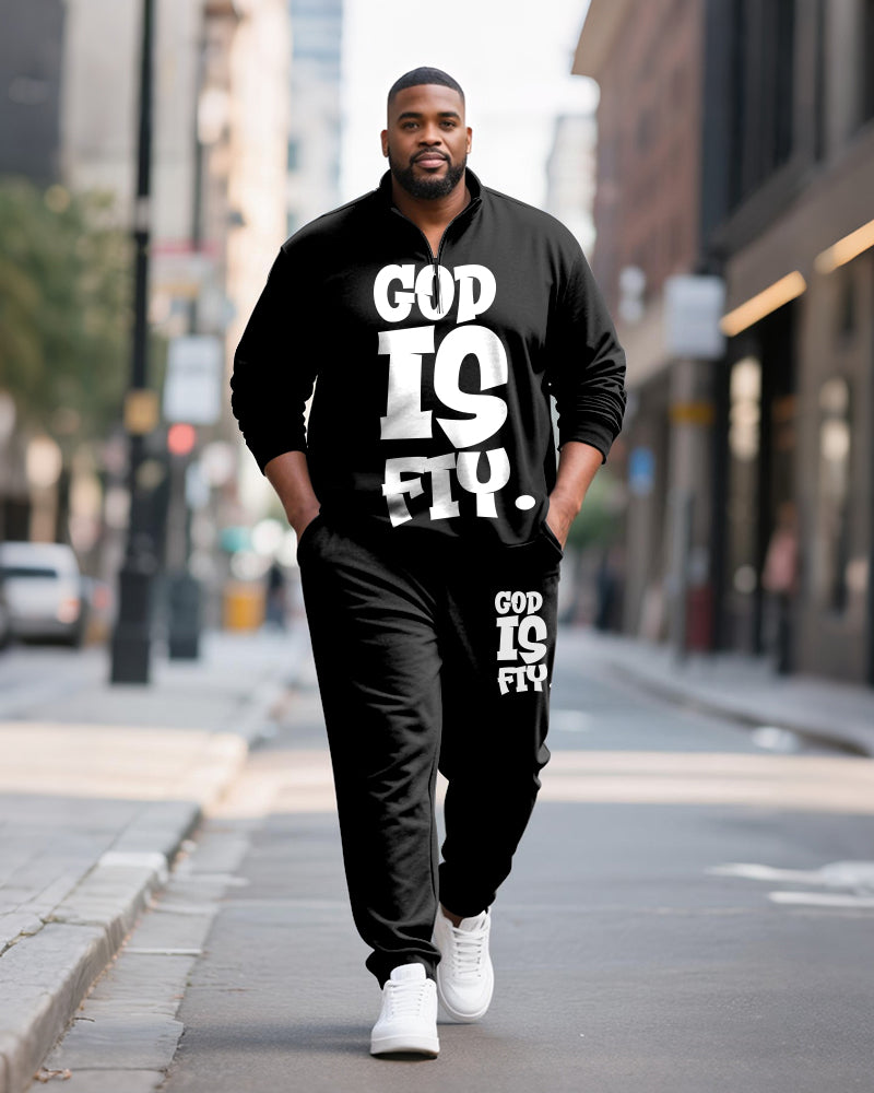 Big & Tall Men's GOD IS FIY Letter Print POLO Collar Zipper Long Sleeve Pants Two-Piece Set