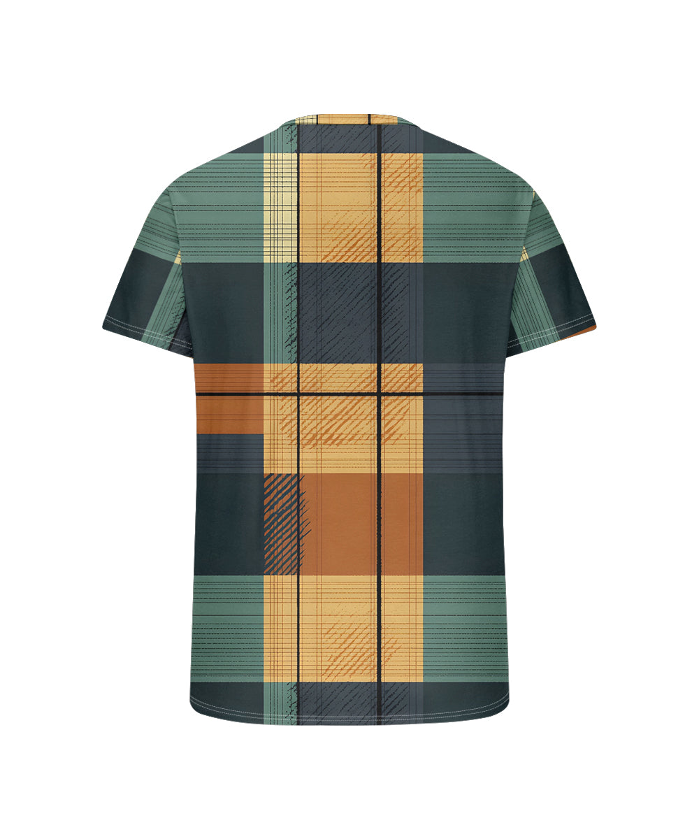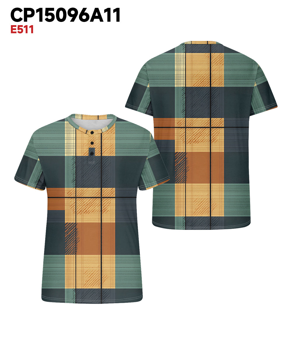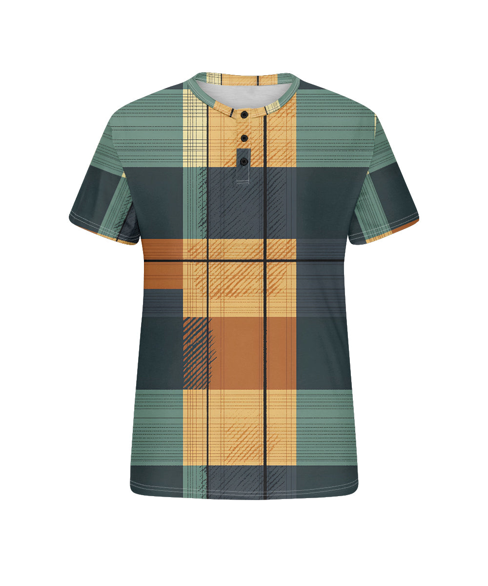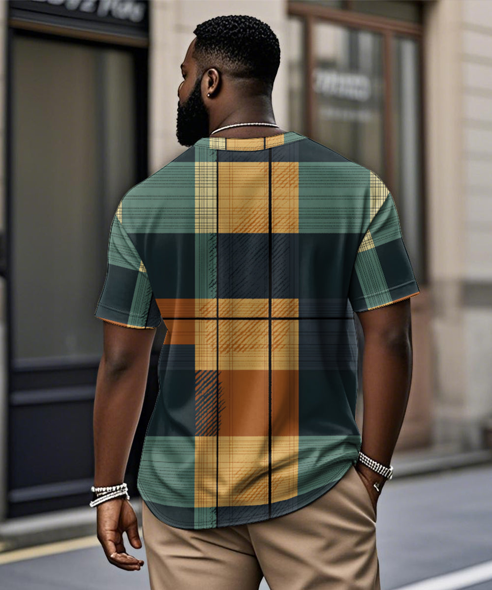 Big & Tall Men's Green And Yellow Geometric Plaid Printed Henry Collar Button Short Sleeve T-Shirt