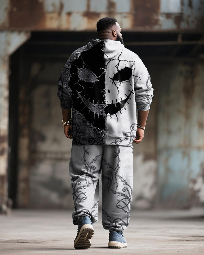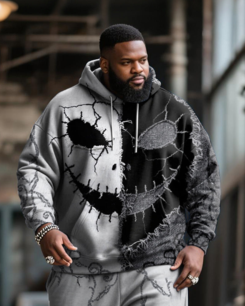 Big & Tall Men's Halloween Black Grey Skull Expression Contrast Stitch Print Hoodie Suit