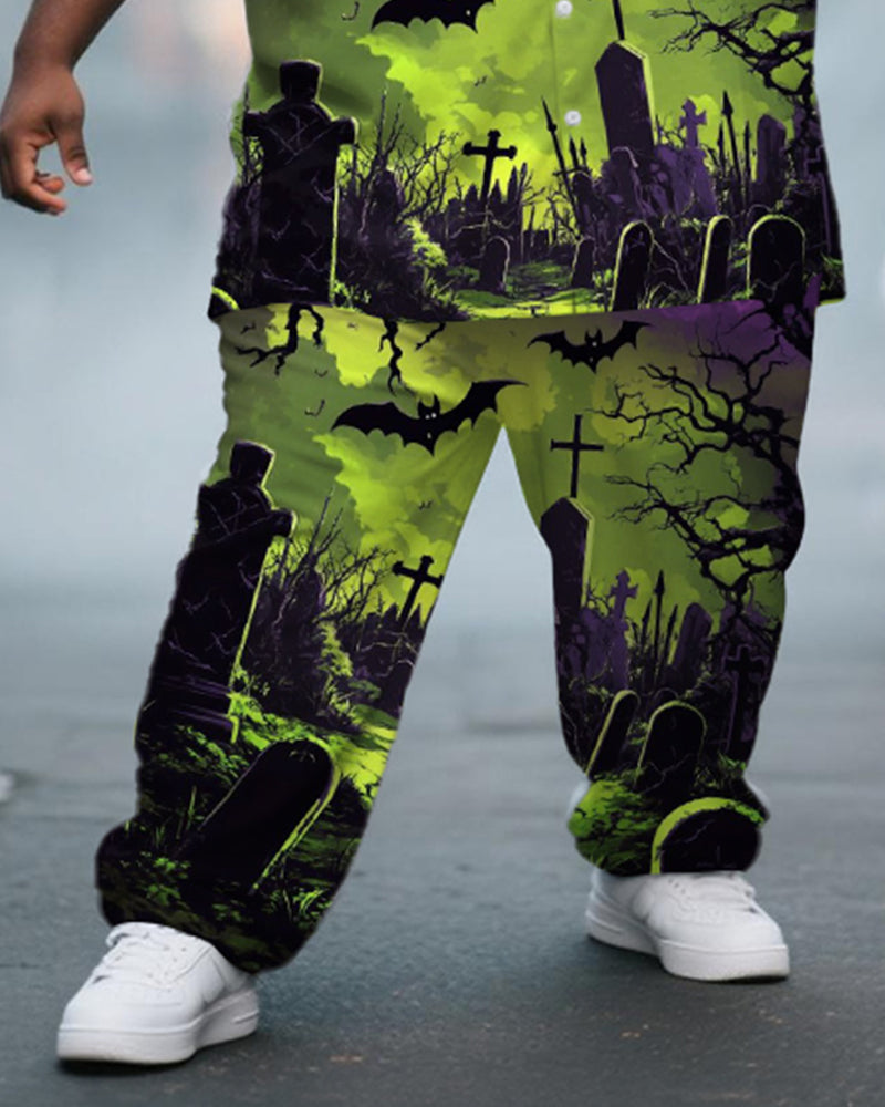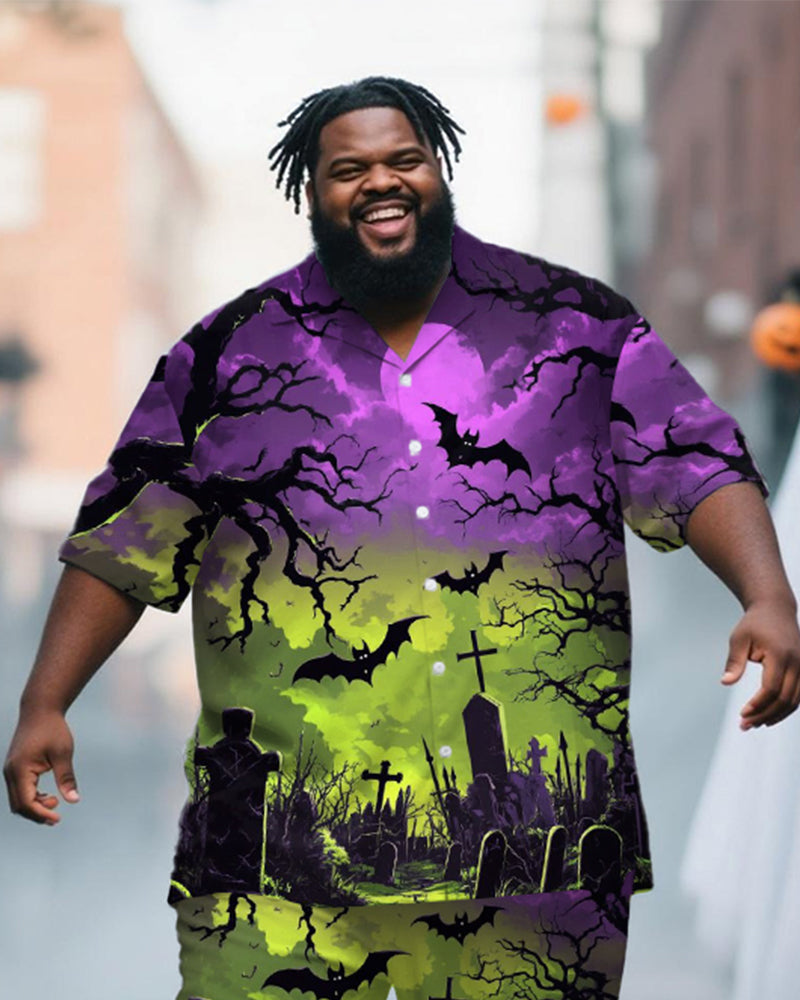 Big & Tall Men's Halloween Purple Green Graffiti Cross Print Short Sleeve Shirt Trousers Suit