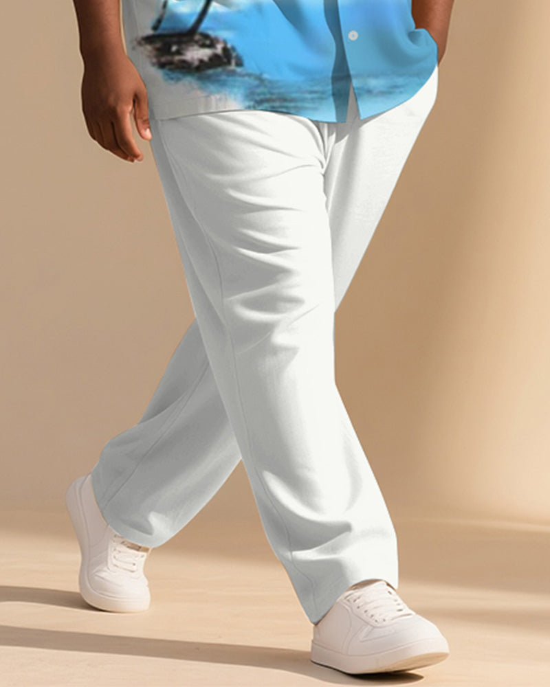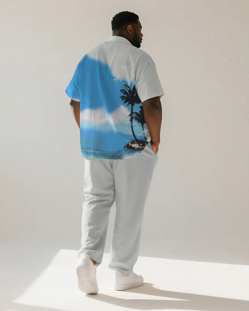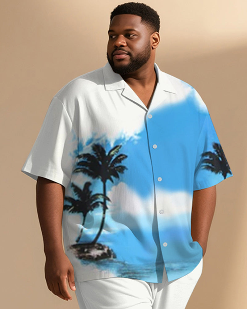 Big & Tall Men's Hawaii Blue Sky Clouds Coconut Tree Print Short Sleeve Shirt Pants Suit