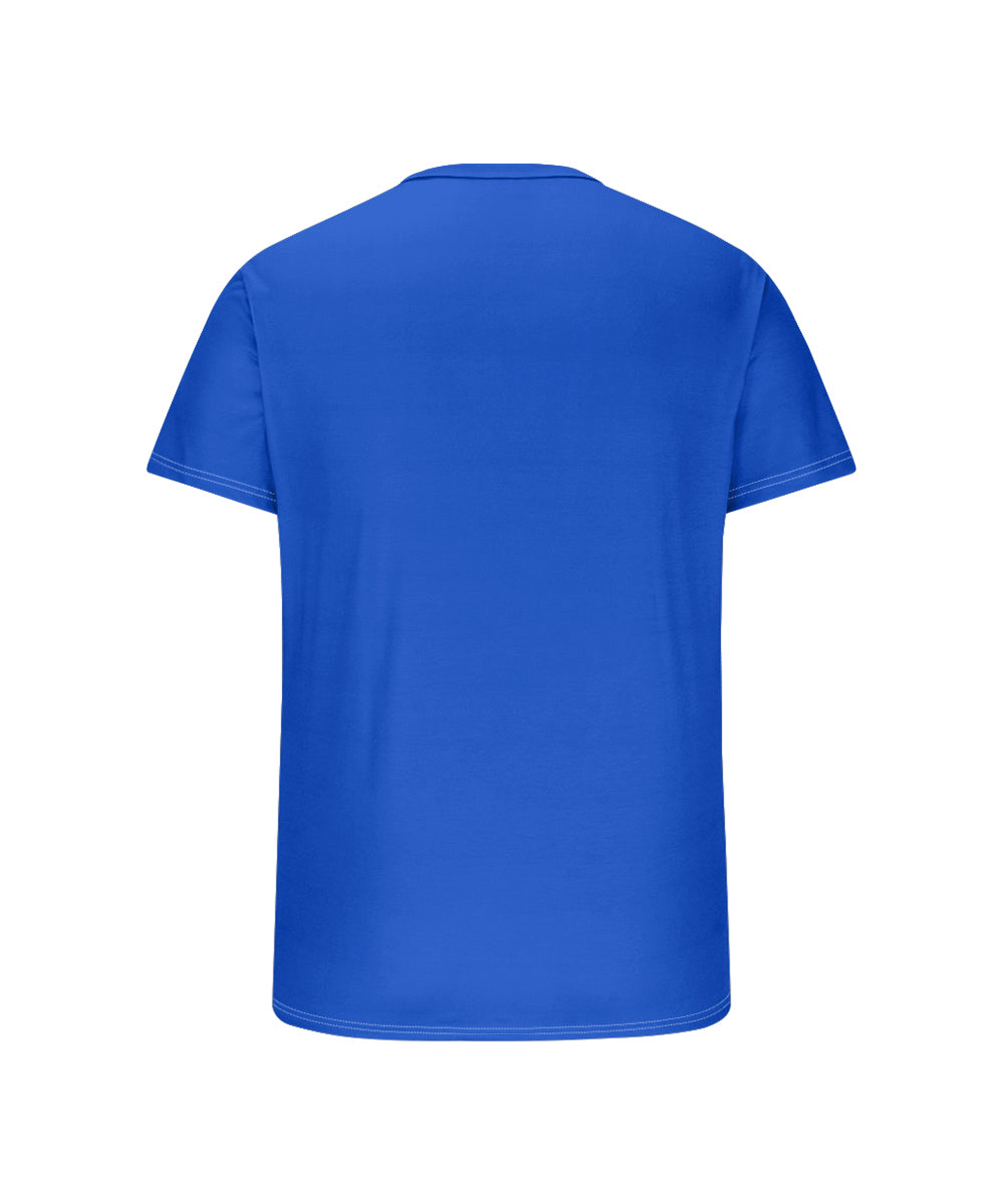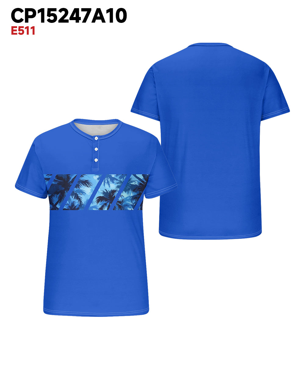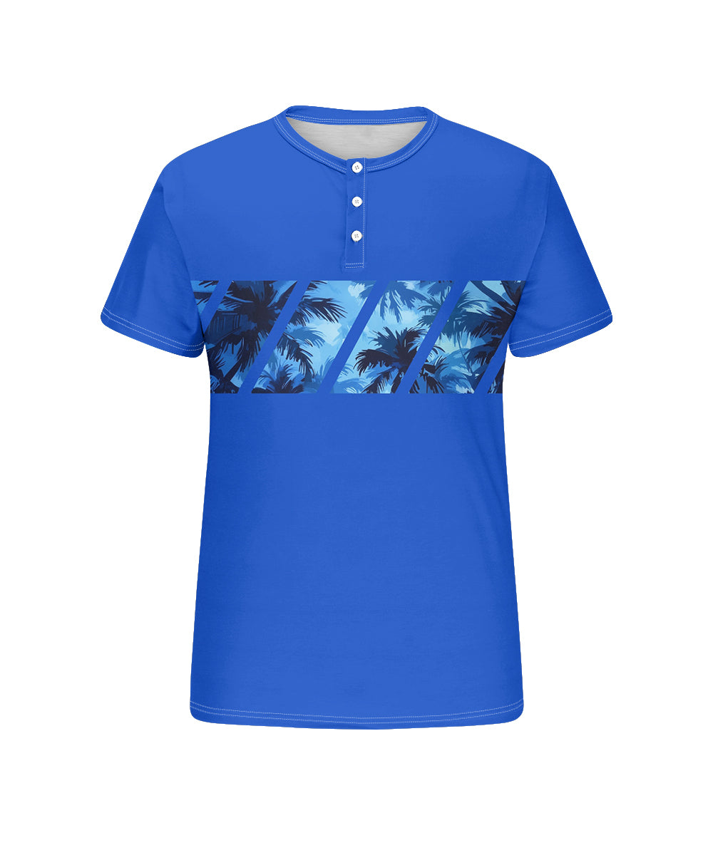 Big & Tall Men's Hawaiian Blue Patchwork Coconut Tree Print Henry Collar Button Short Sleeve T-Shirt