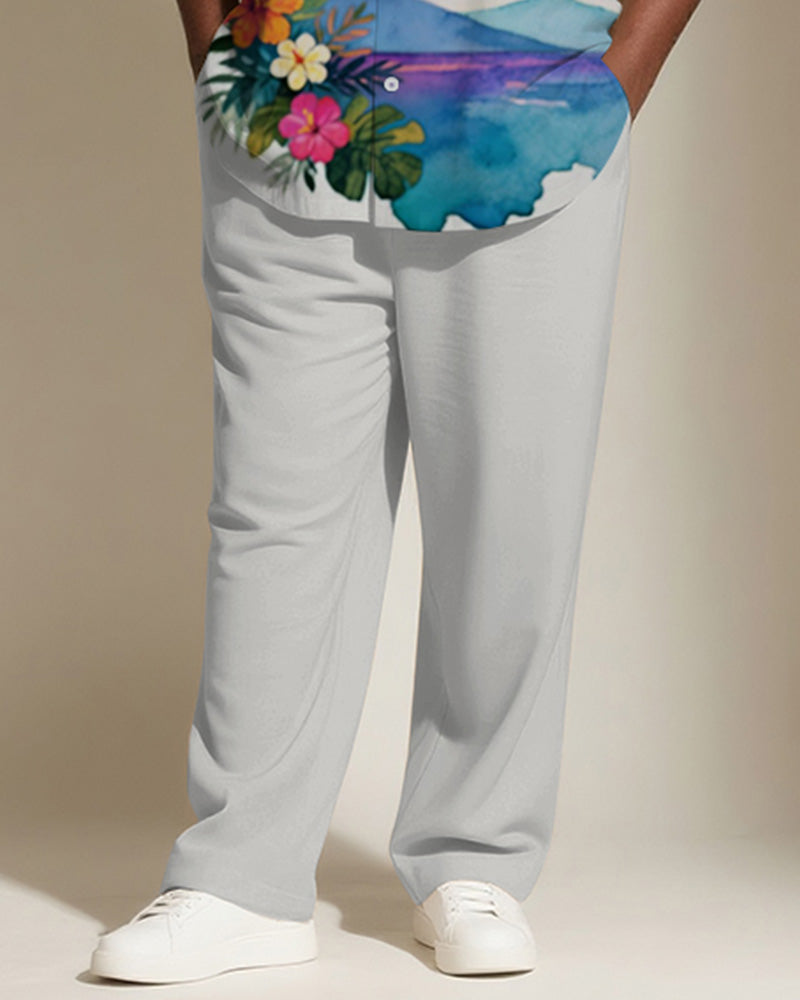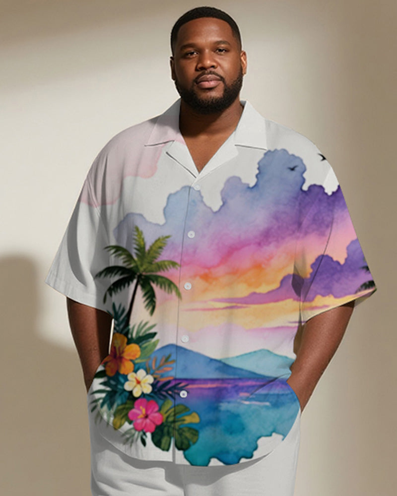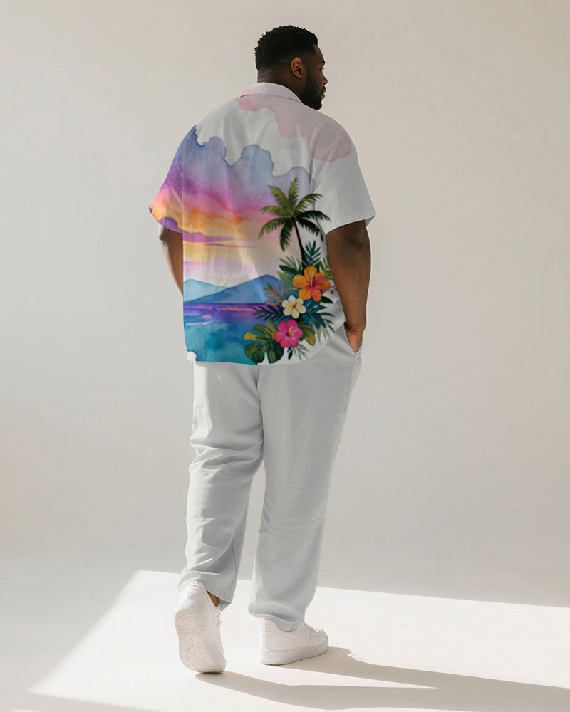 Big & Tall Men's Hawaiian Purple Ink Sunset Coconut Tree Printed Short Sleeve Shirt Pants Suit