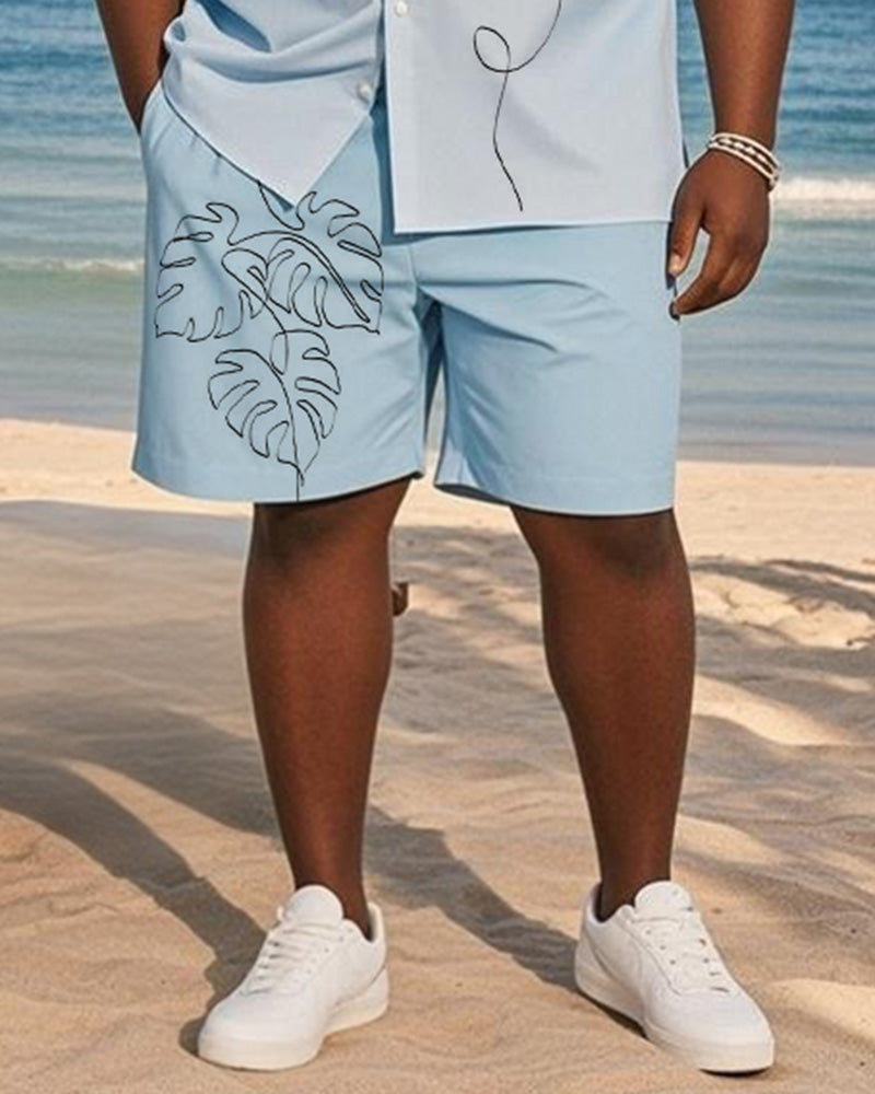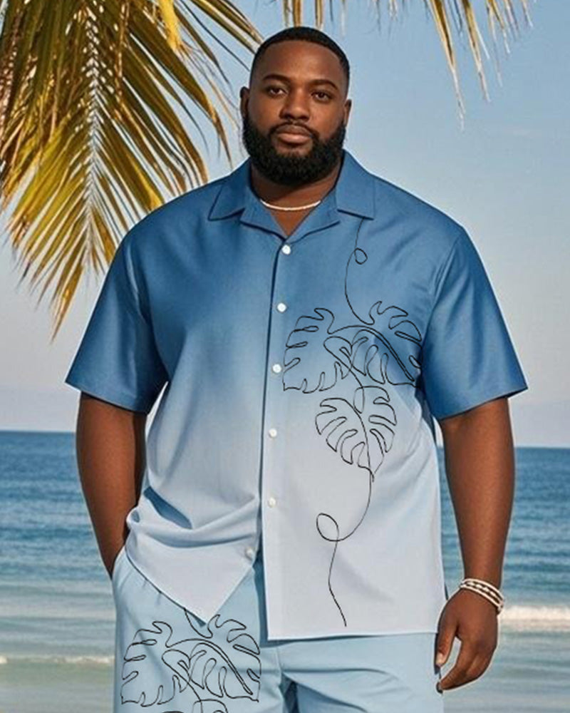 Big & Tall Men's Hawaiian Vacation Blue Gradient Line Leaf Print Shirt Shorts Suit