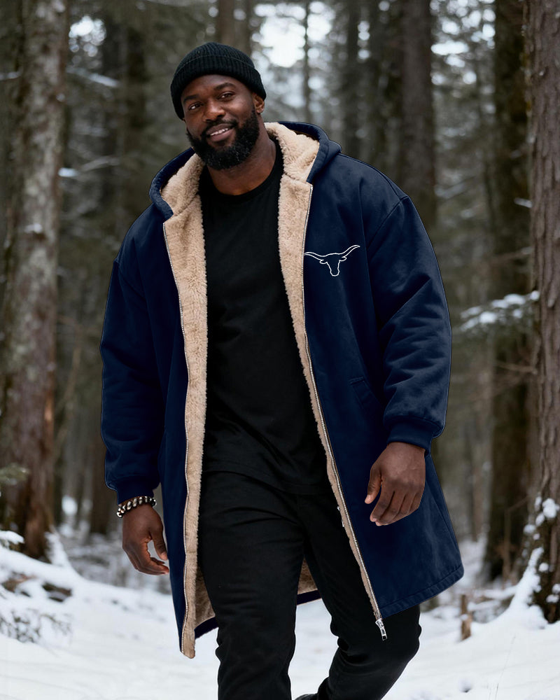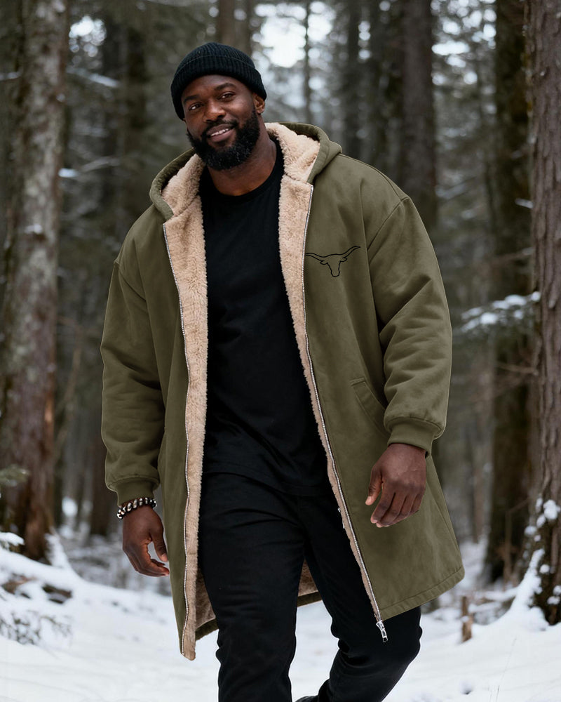 Big & Tall Men's Hunting Style Bull Totem Print Velvet Thickened Long Hooded Coat