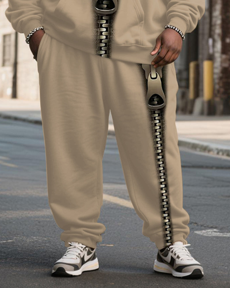 Big & Tall Men's Khaki Three-Dimensional Zipper Decorative Printed Hoodie Set