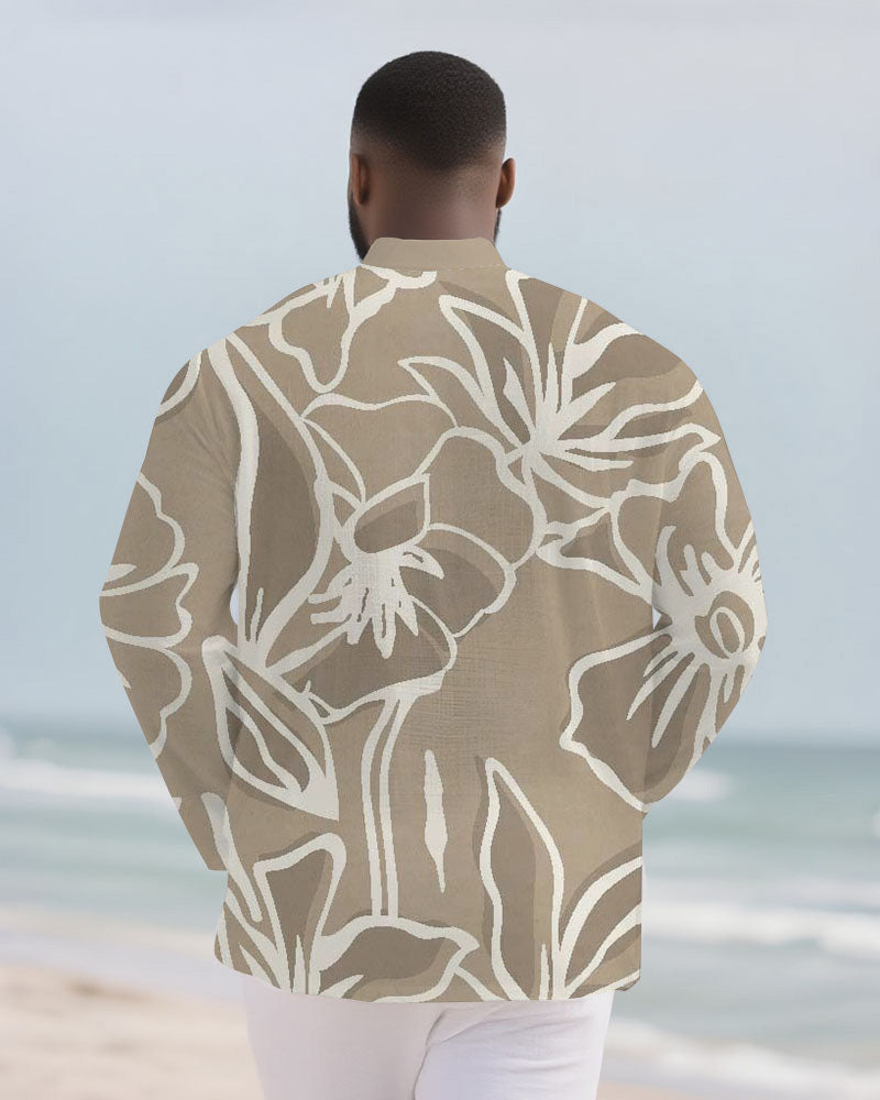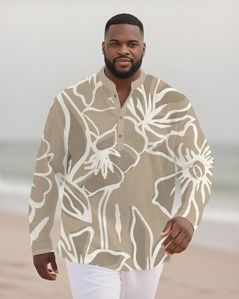Big & Tall Men's Khakis Floral Print Bamboo Hemp Texture Henry Collar Long Sleeve Shirt