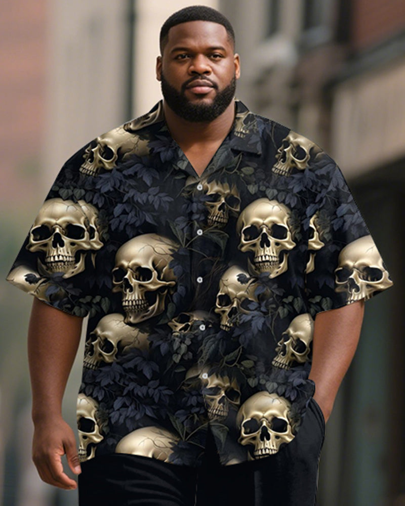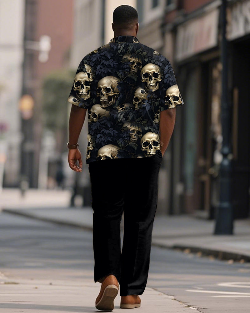 Big & Tall Men's Leaf Black Skull Print Short Sleeve Shirt Trousers Suit