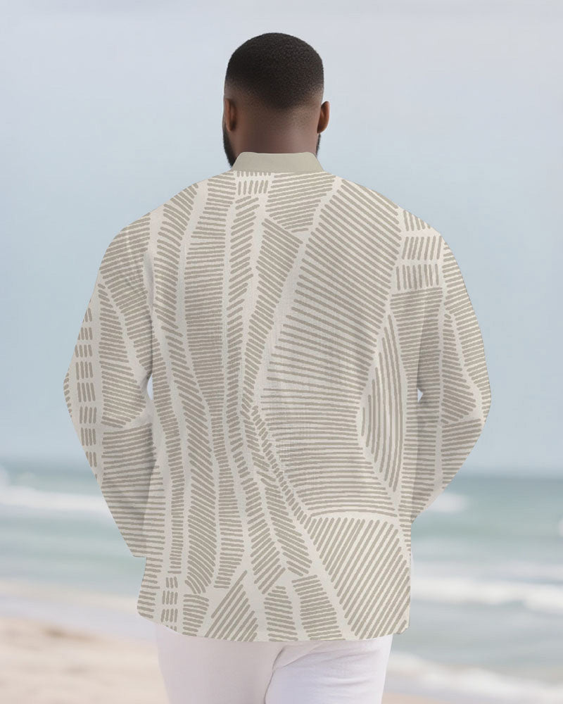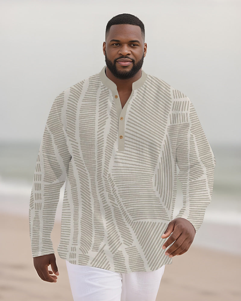 Big & Tall Men's Light Gray Leaf Print Bamboo Hemp Texture Henry Collar Long Sleeve Shirt