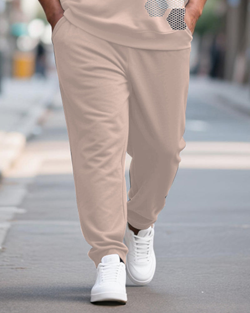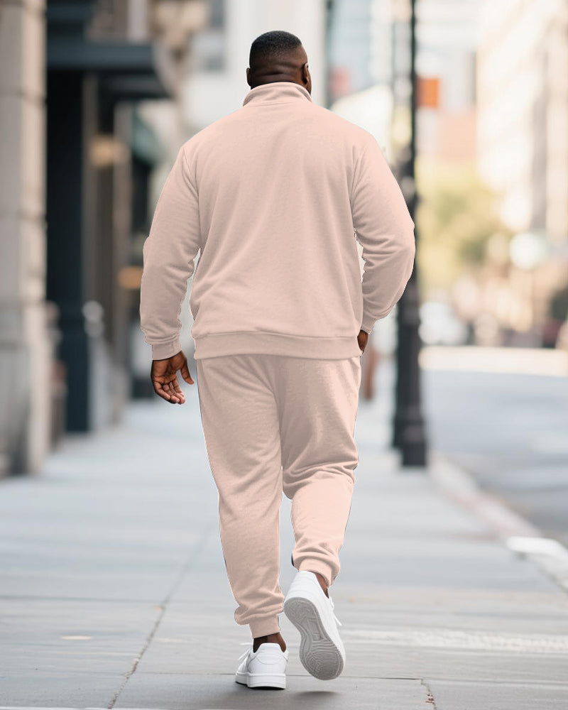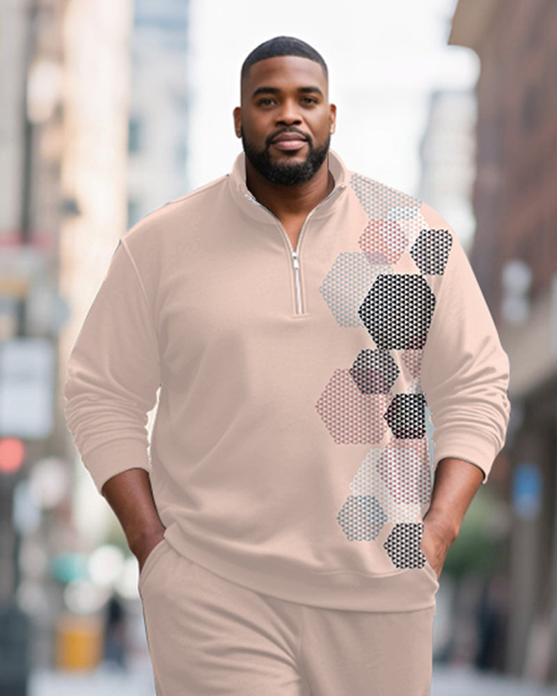 Big & Tall Men's Pink Geometric Print POLO Collar Zipper Long Sleeve Pants Two-Piece Set