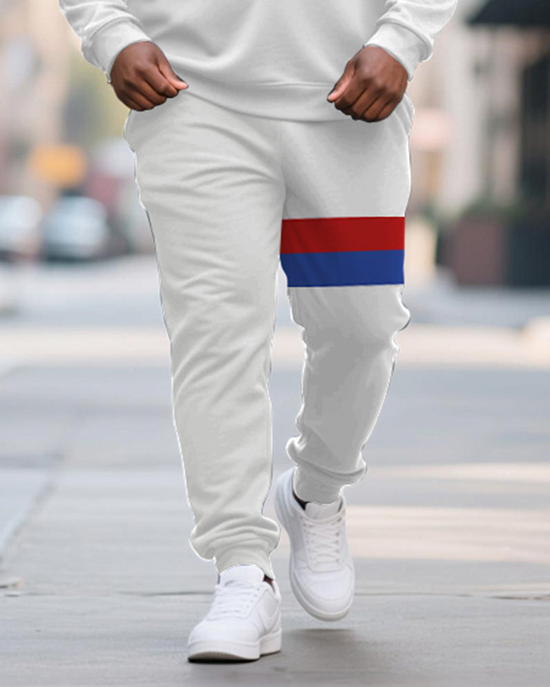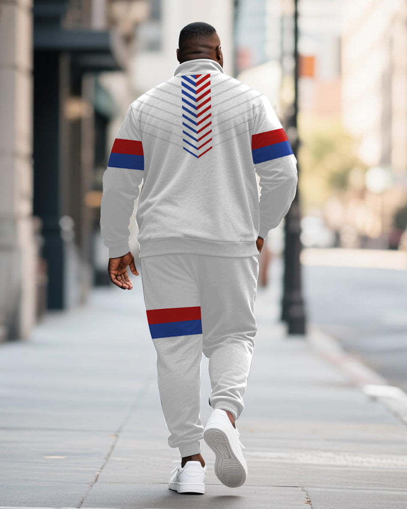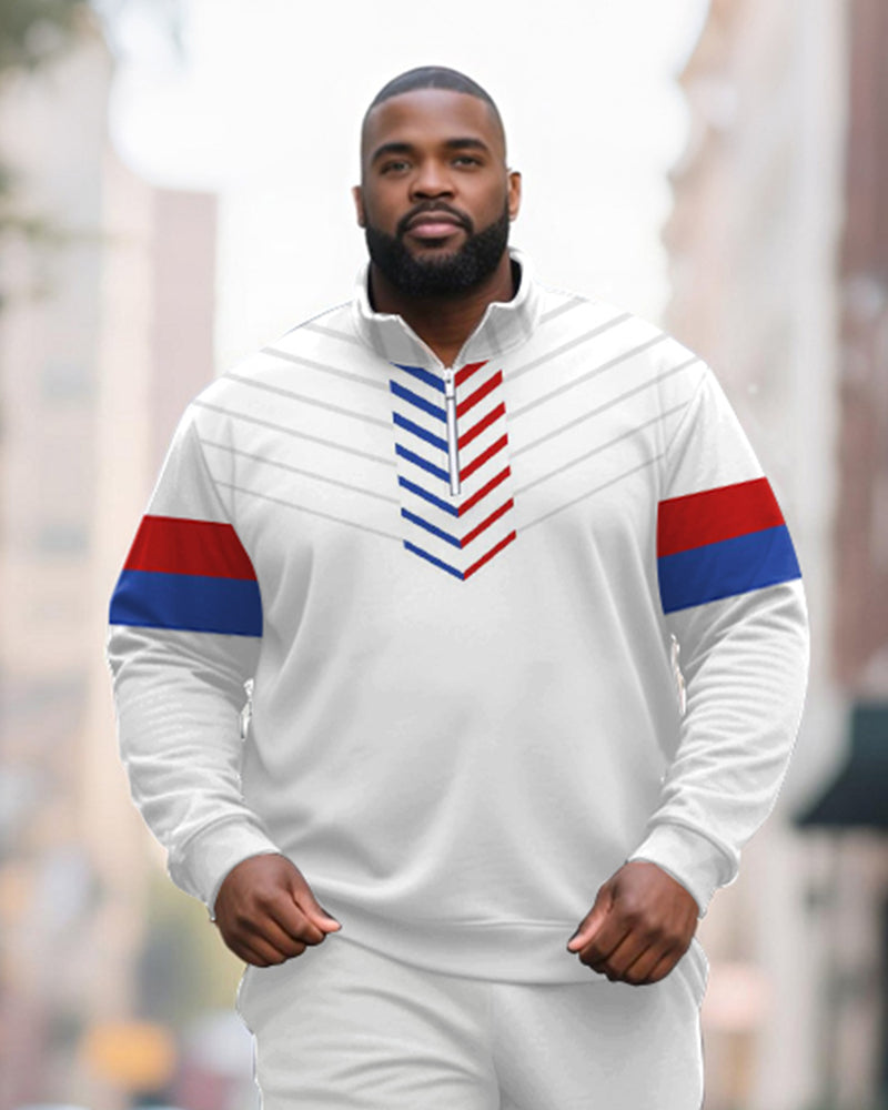 Big & Tall Men's Red And Blue Striped Contrast Printed POLO Collar Zipper Long Sleeve Pants Two-piece Set