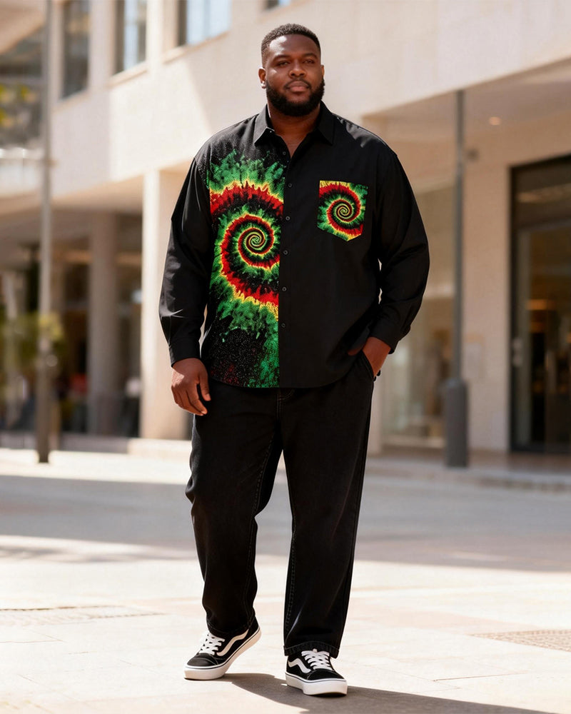 Big & Tall Men's Red, Yellow And Green Swirl Tie-dye Stitching Printed Long Sleeve Shirt And Trousers Set