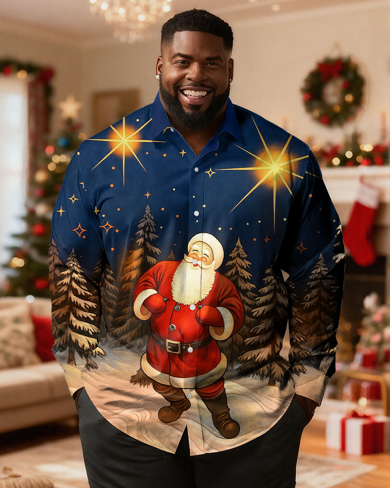 Big & Tall Men's Retro Santa Claus Print Long Sleeve Shirt