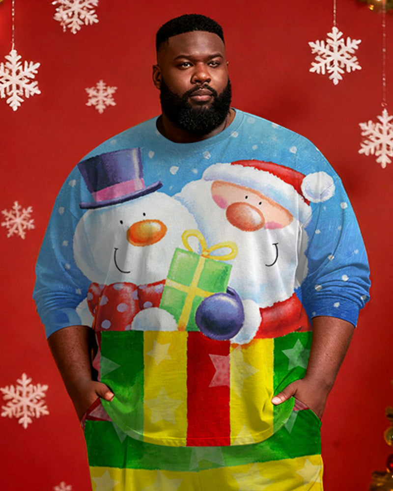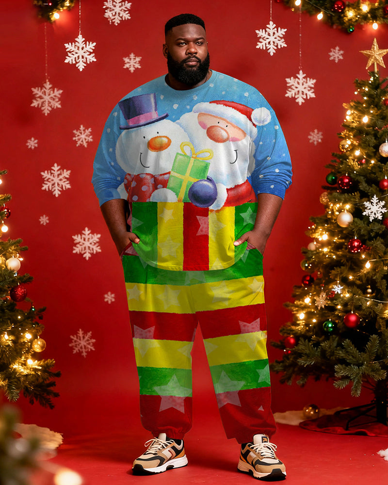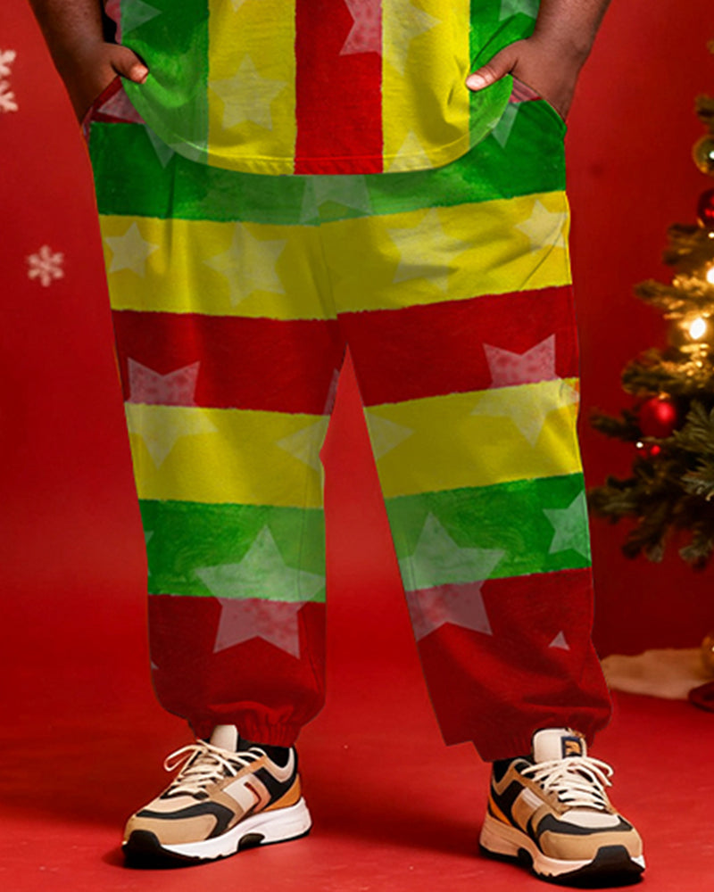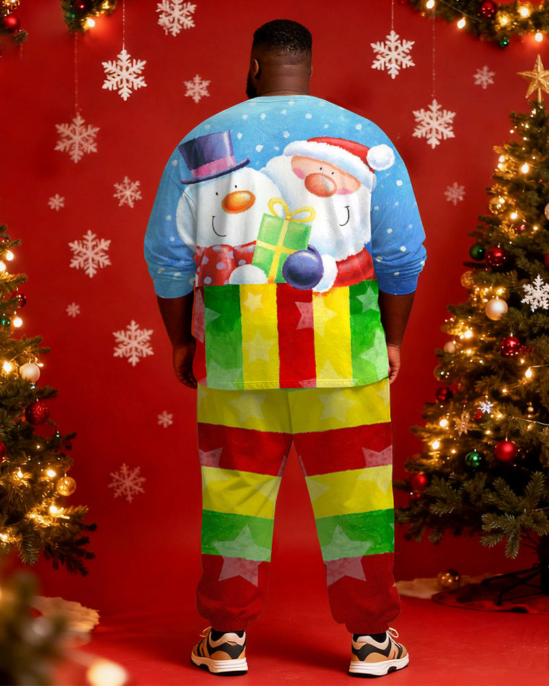Big & Tall Men's Santa Claus Color Striped Graffiti Print Long Sleeve T-Shirt Pants Set