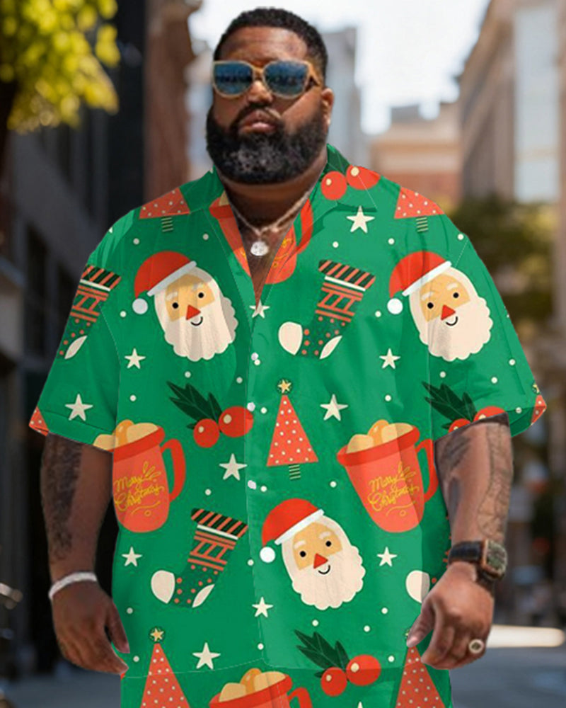 Big & Tall Men's Santa Claus Graffiti Green Print Short Sleeve Shirt Shorts Set