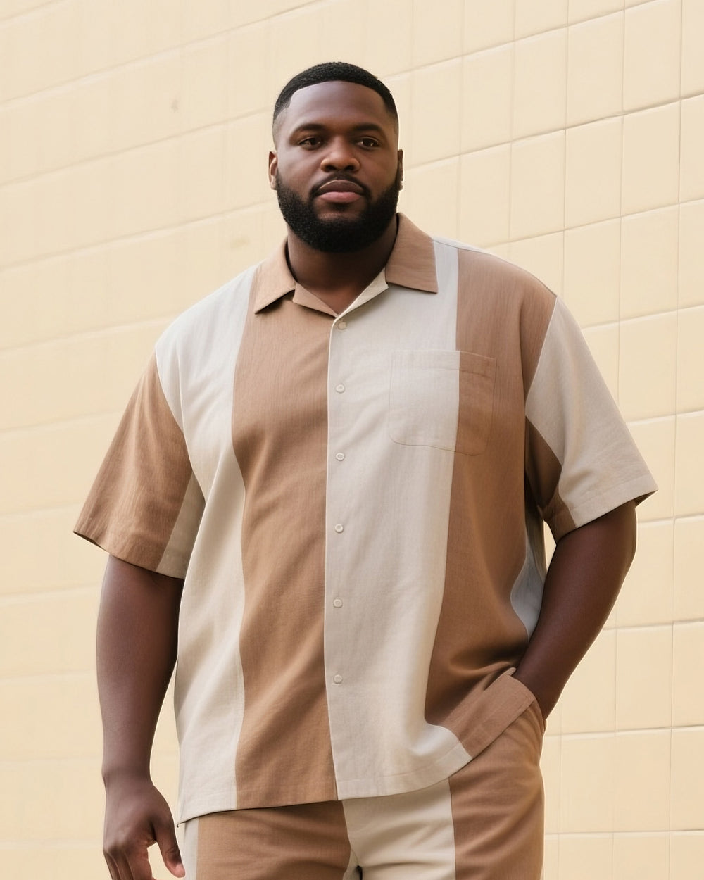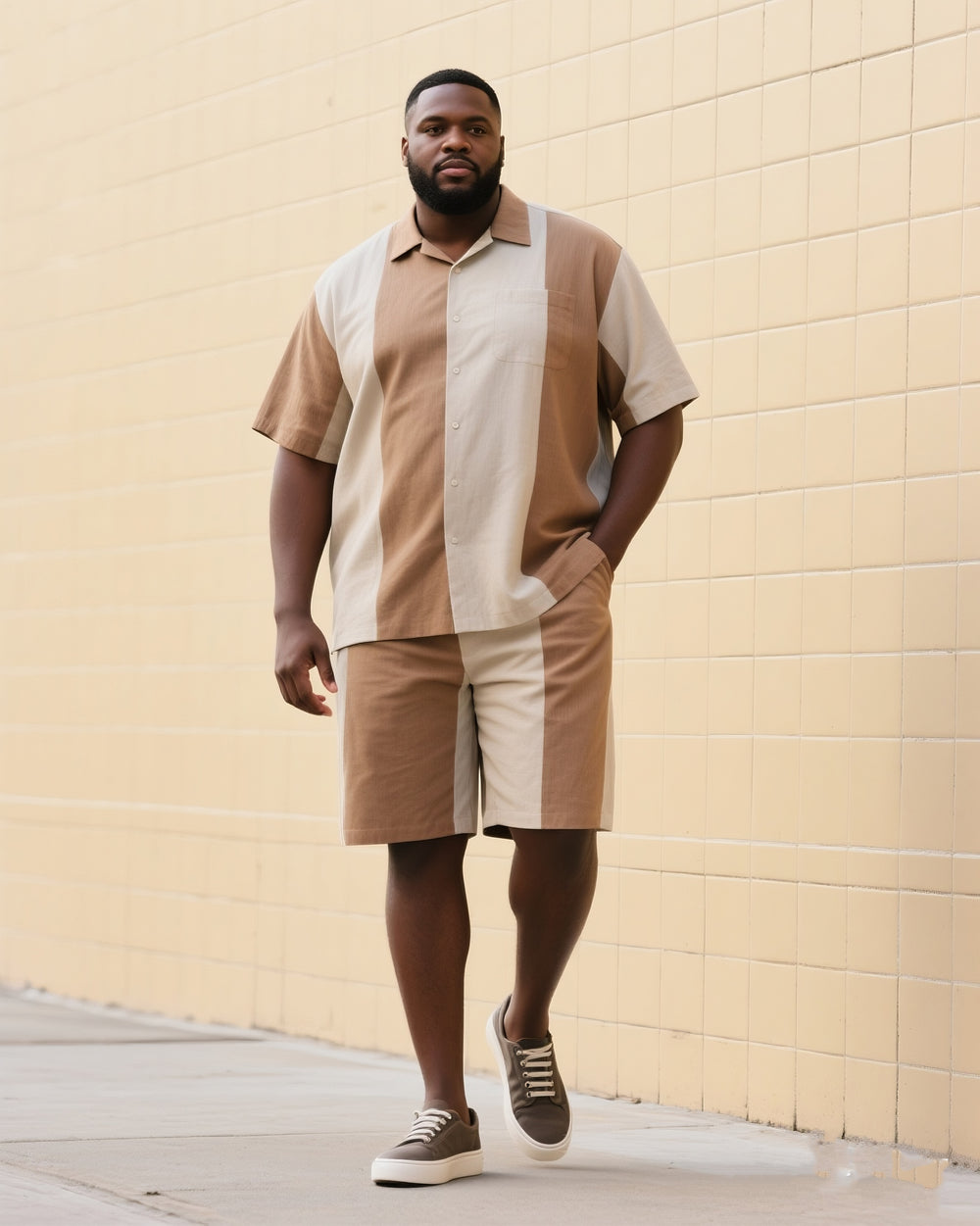 Big & Tall Men's Street Fashion Daily Casual Khaki Spelling Brown Striped Shirt Shorts Suit