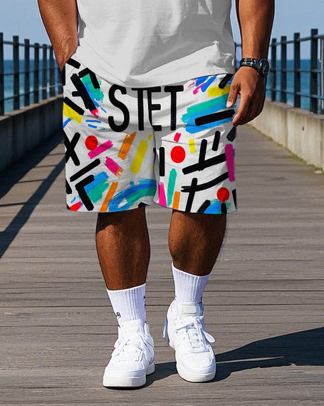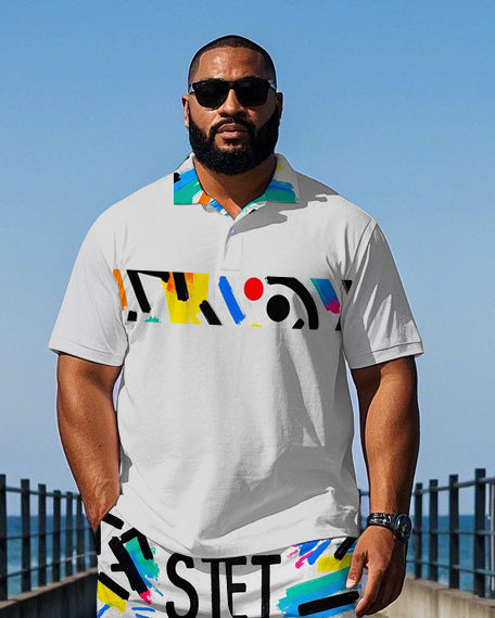 Big & Tall Men's Street Fashion Graffiti Letter Stripe Printed Short Sleeve Polo Shirt Shorts Set