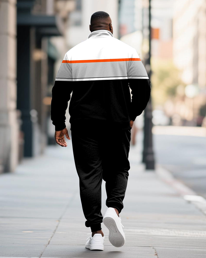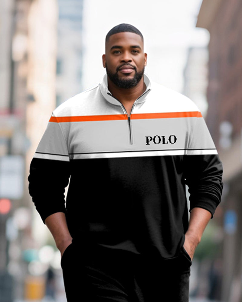 Big & Tall Men's Striped Contrast Printed POLO Collar Zipper Long Sleeve Pants Two-Piece Set