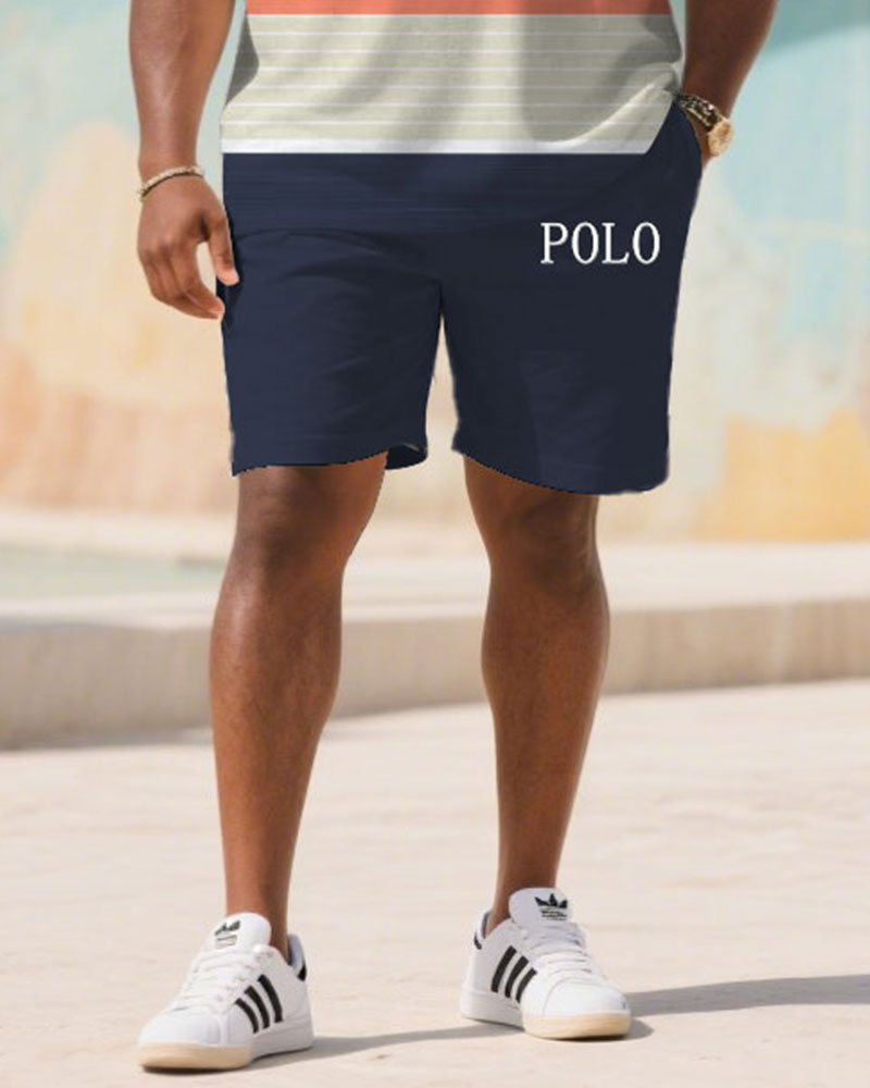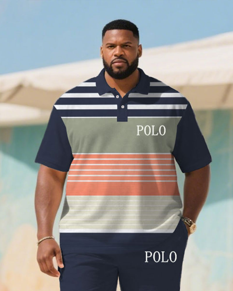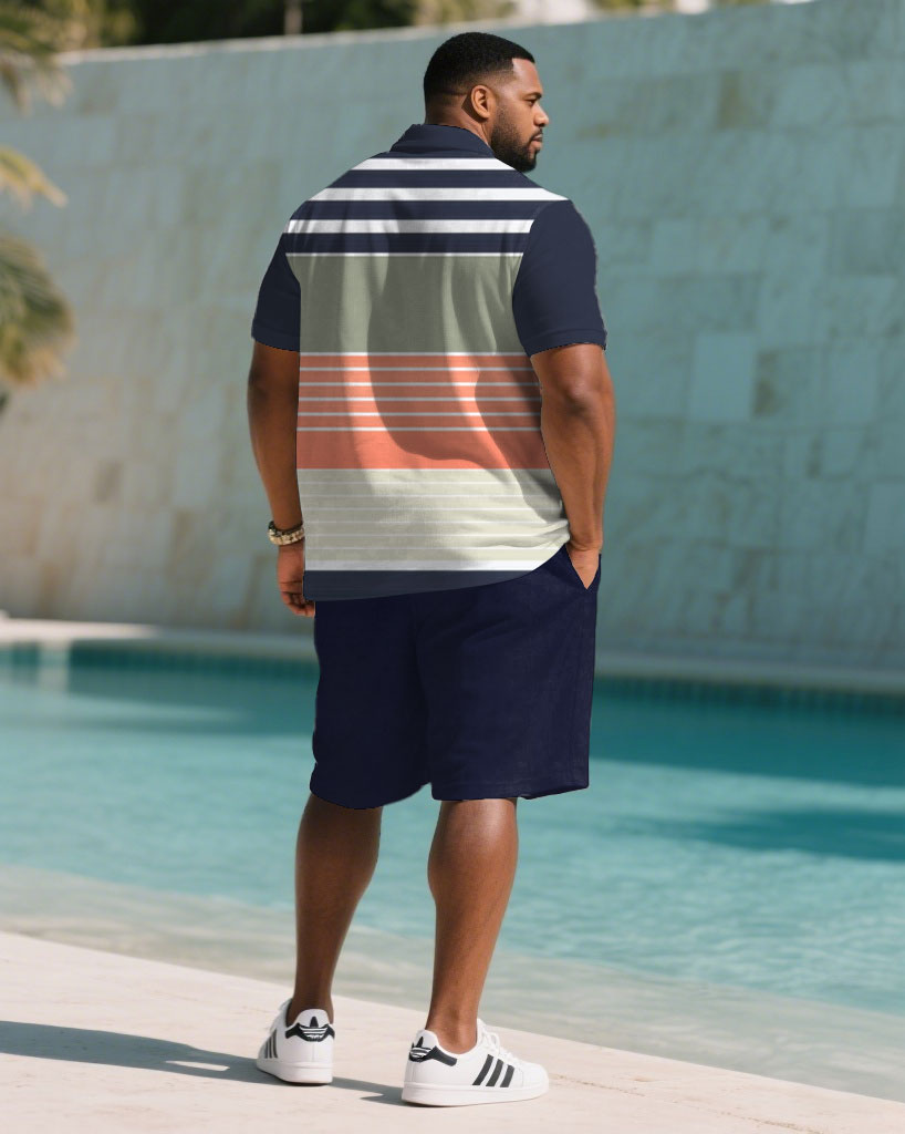 Big & Tall Men's Summer Dark Blue & White & Orange Striped Polo Short Sleeve Shirt Shorts Suit
