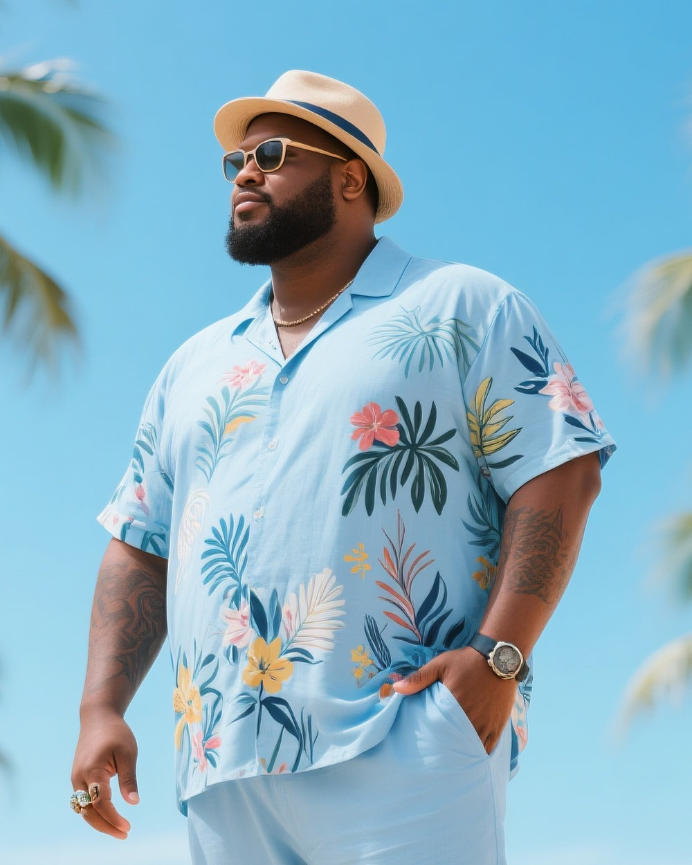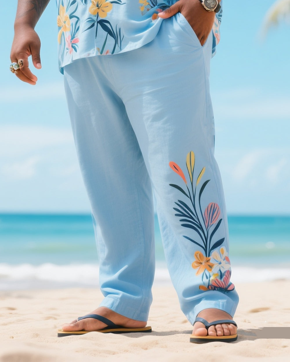 Big & Tall Men's Summer Vacation Style Color Matching Psychedelic Floral Printed Short Sleeve Shirt Trousers Cotton Linen Suit