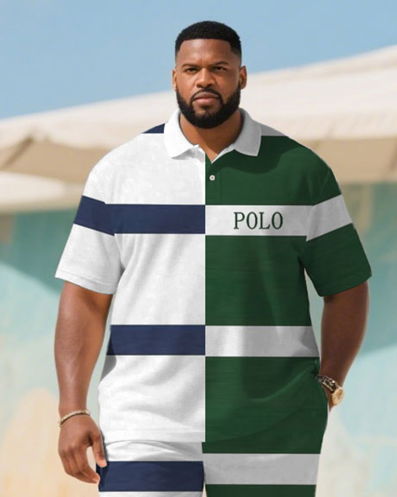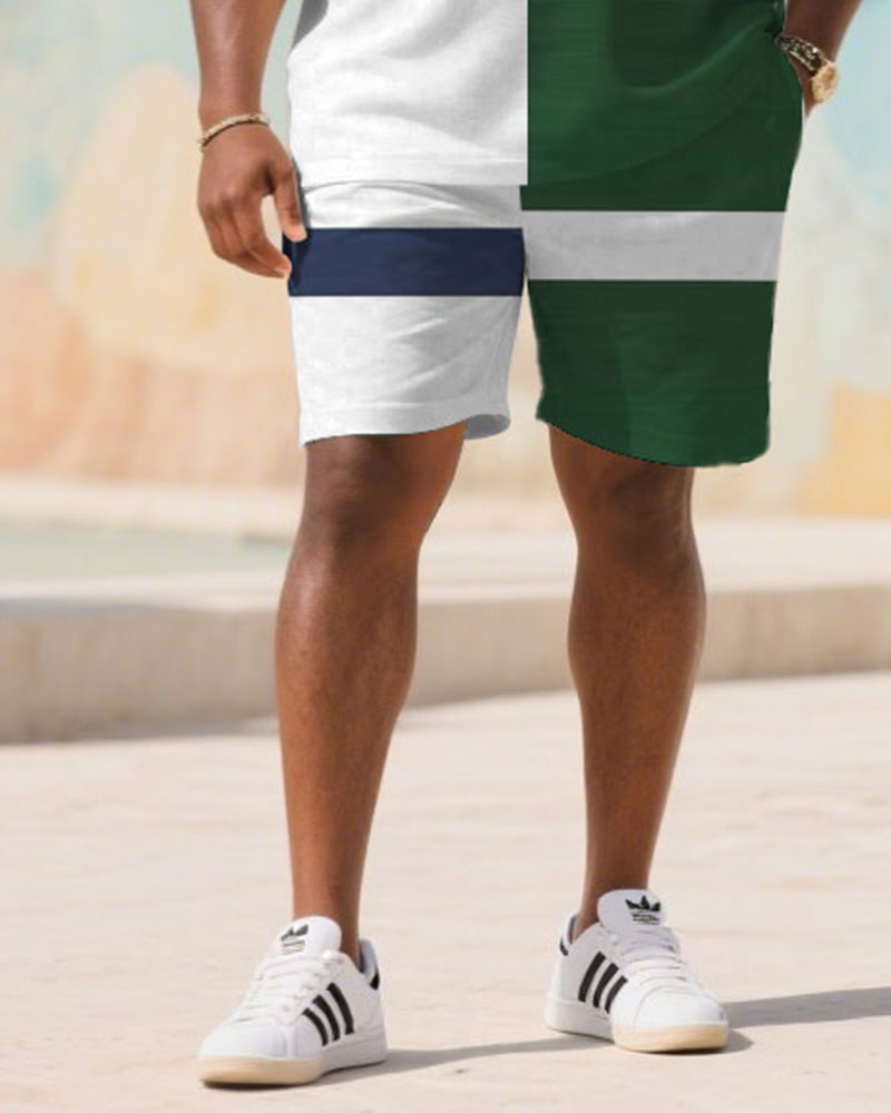 Big & Tall Men's Summer White & Green Geometric Colorblock Polo Short Sleeve Shirt Shorts Suit