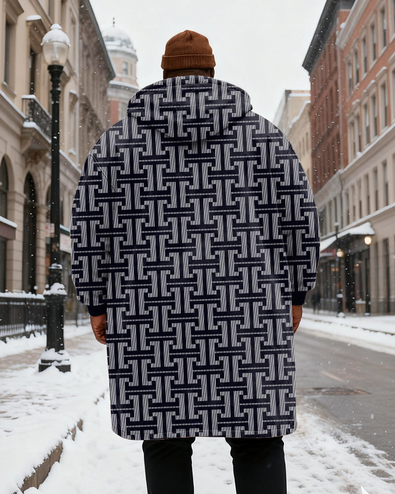 Big & Tall Men's Vintage Geometric Blue Printed Velvet Thickened Long Hooded Coat