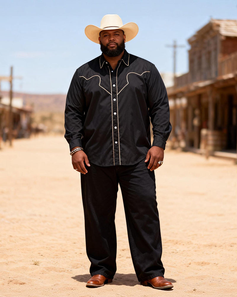 Big & Tall Men's Western Black Bottom Rice White Decorative Line Printed Long Sleeve Shirt Pants Set