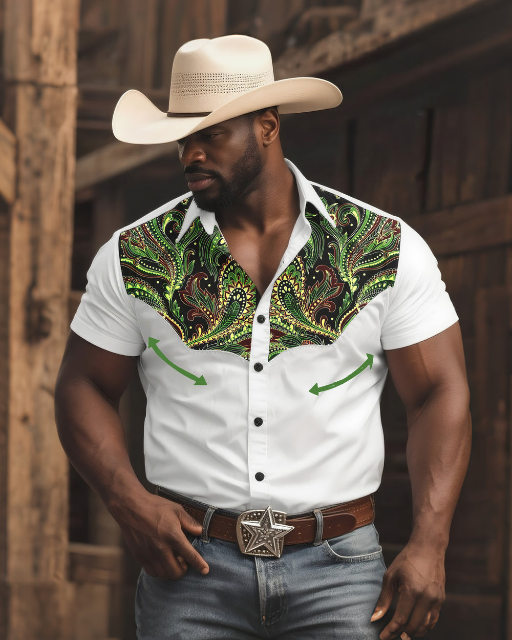 Big & Tall Men's Western Color Block White & Green Short Sleeve Shirt