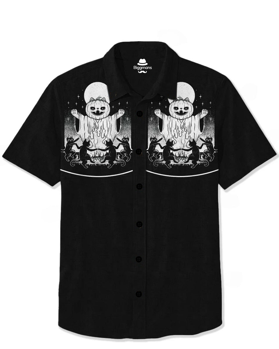 Big & Tall Men's Western Halloween Cat Fire Print-Black Short Sleeve Shirt Pants Suit
