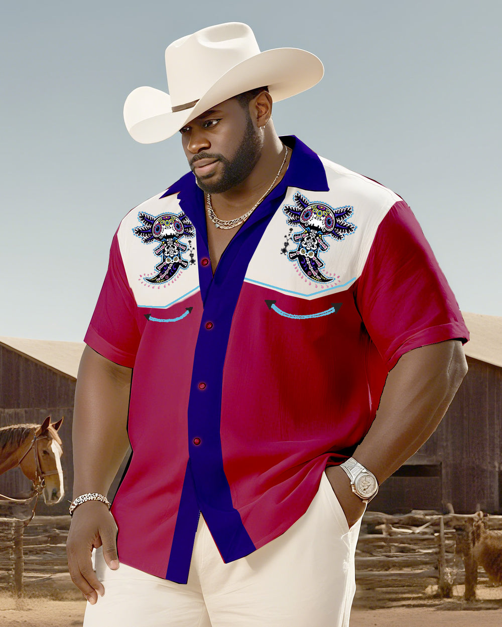 Big & Tall Men's Western Style Color Matching Casual Axolotl Skull Print-short Sleeve Shirt Pants Suit