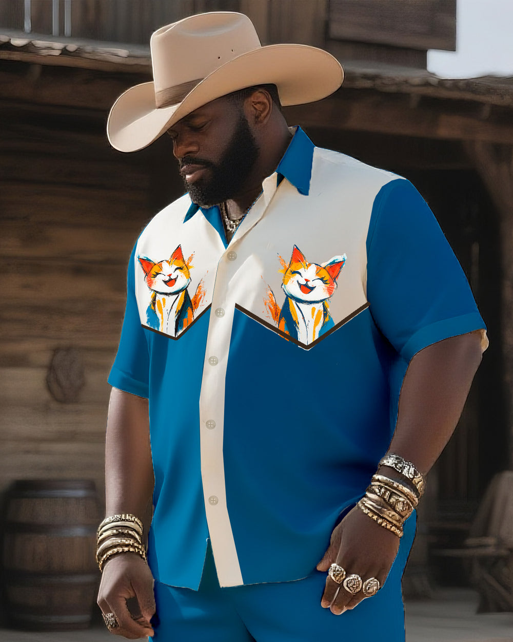 Big & Tall Men's Western Style Color Matching Casual Cute Cat Printing-short Sleeve Shirt Pants Suit