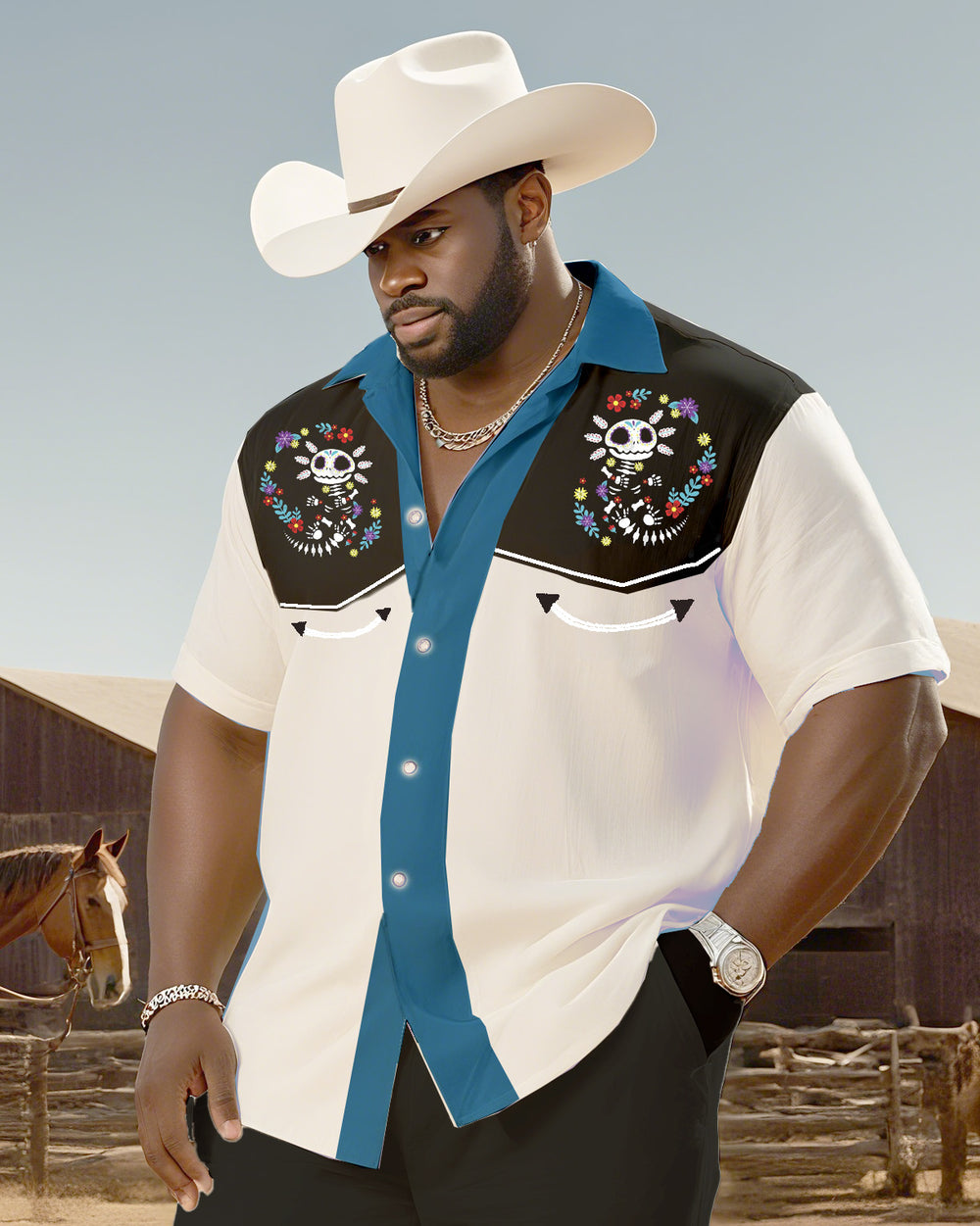 Big & Tall Men's Western Style Color Matching Casual Salamander Skull Print-short Sleeve Shirt Pants Suit