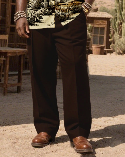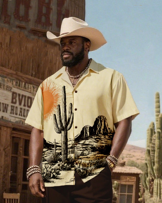 Big & Tall Men's Western Wind Desert Cactus Print-Cuban Collar Short Sleeve Shirt Pants Suit