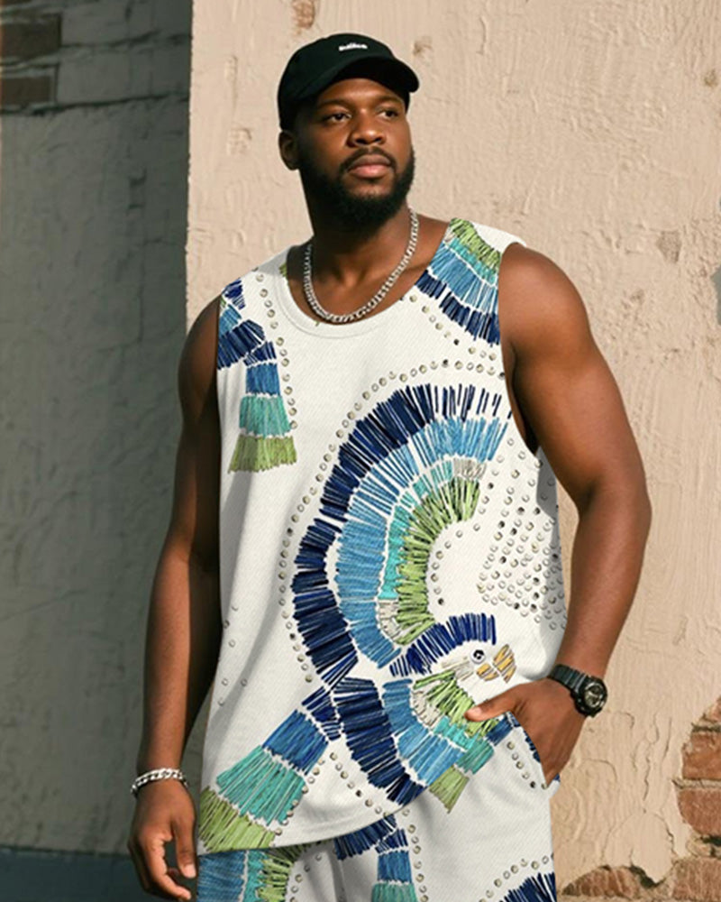 Big & Tall Men's White Vintage Graffiti Bird Print Tank Shorts Suit