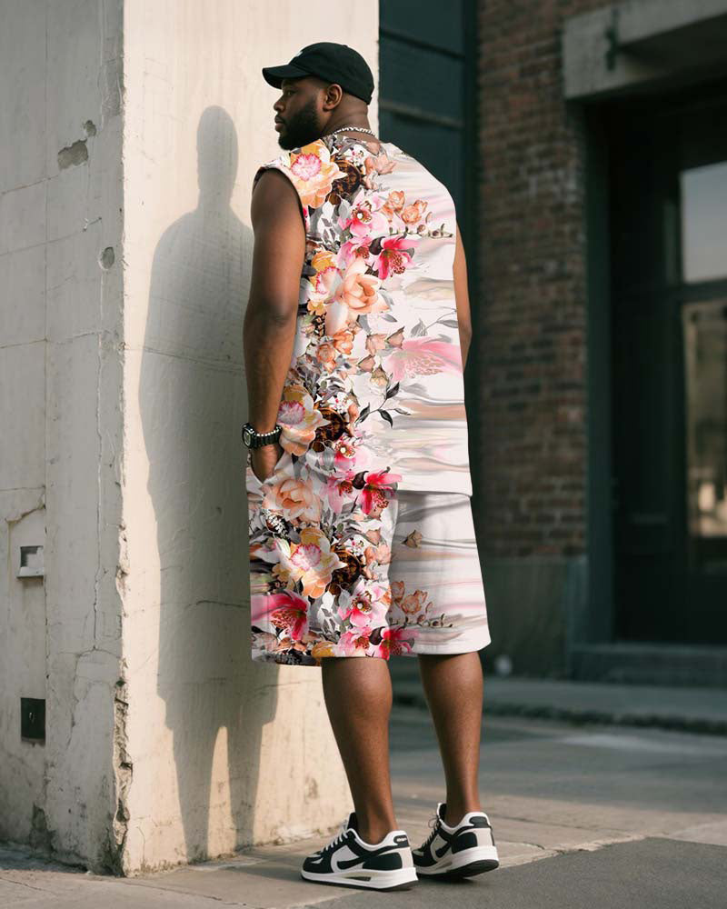 Big & Tall Men's White Vintage Striped Floral Print Tank Top Shorts Suit
